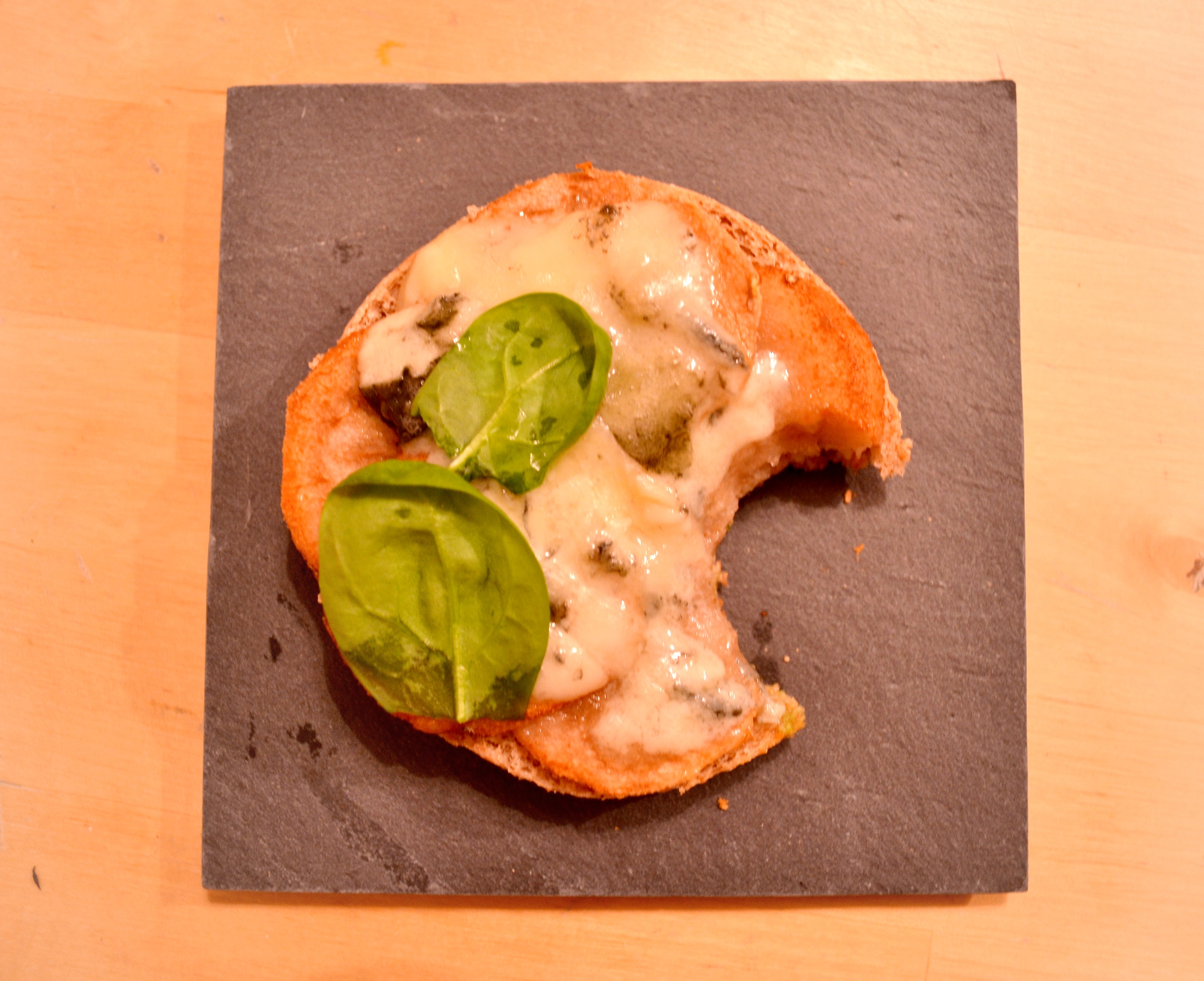 Sortir les tartines du four et les recouvrir des pousses d’épinard.