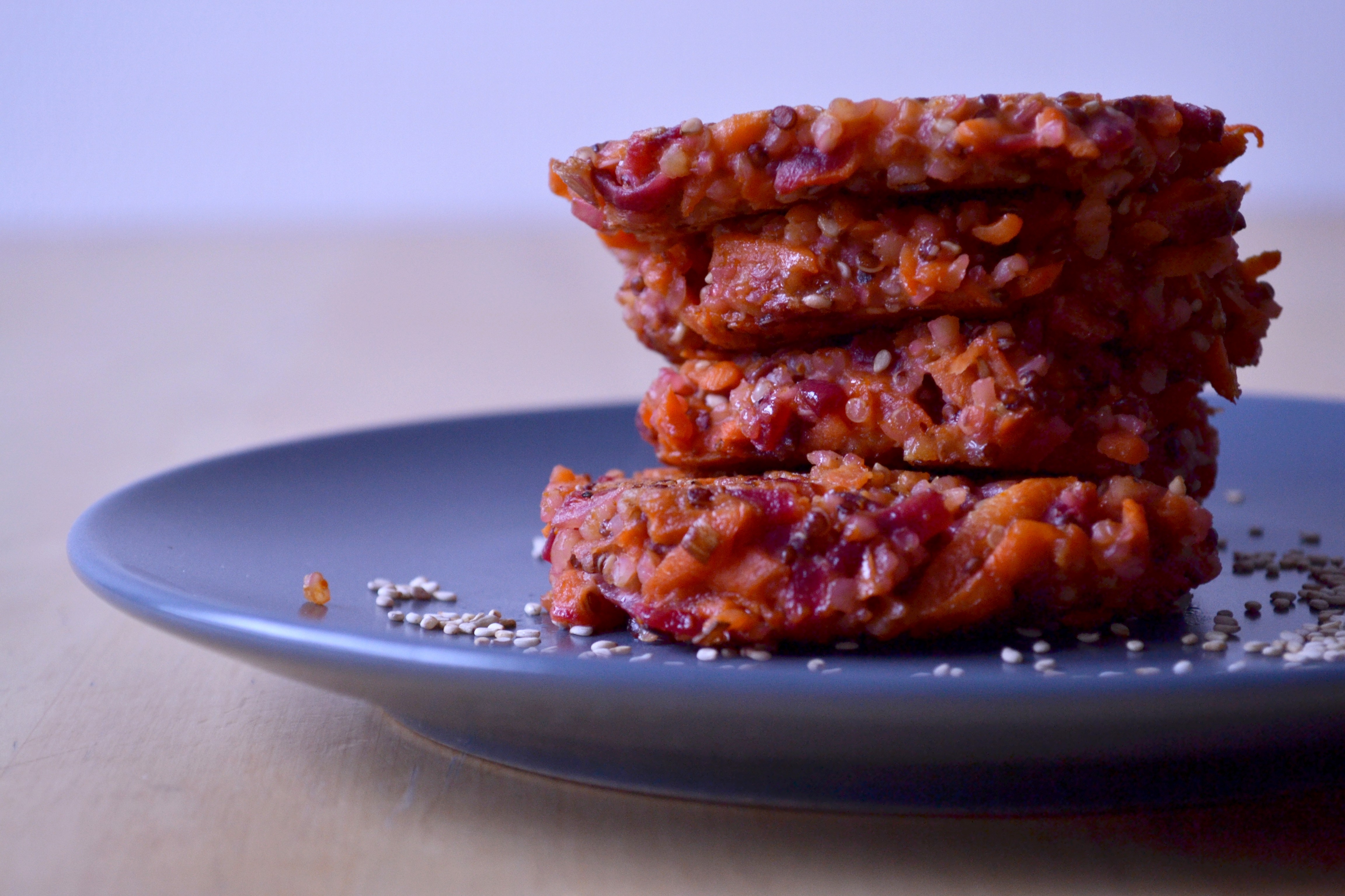 Il y a deux mois, lorsque nous étions à Londres, mes copines et moi avons mangé de délicieuses galettes végétariennes sur Bouroug Market qui, rien que d’y penser, me font encore saliver ! Ce sont donc elles qui ont inspiré cette recette, très facile et plutôt originale. En espérant qu’elles feront d’autres heureux(ses) que moi !