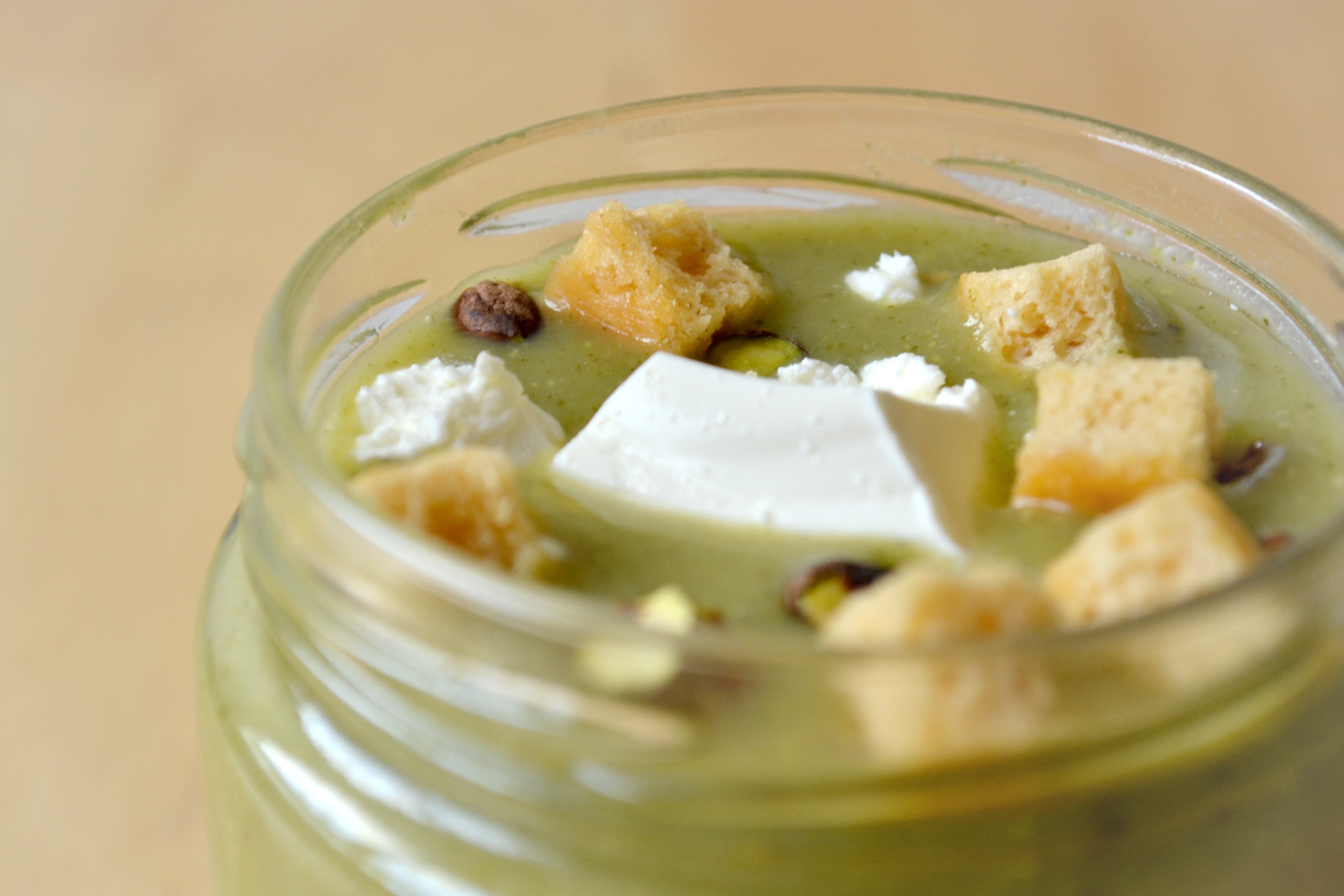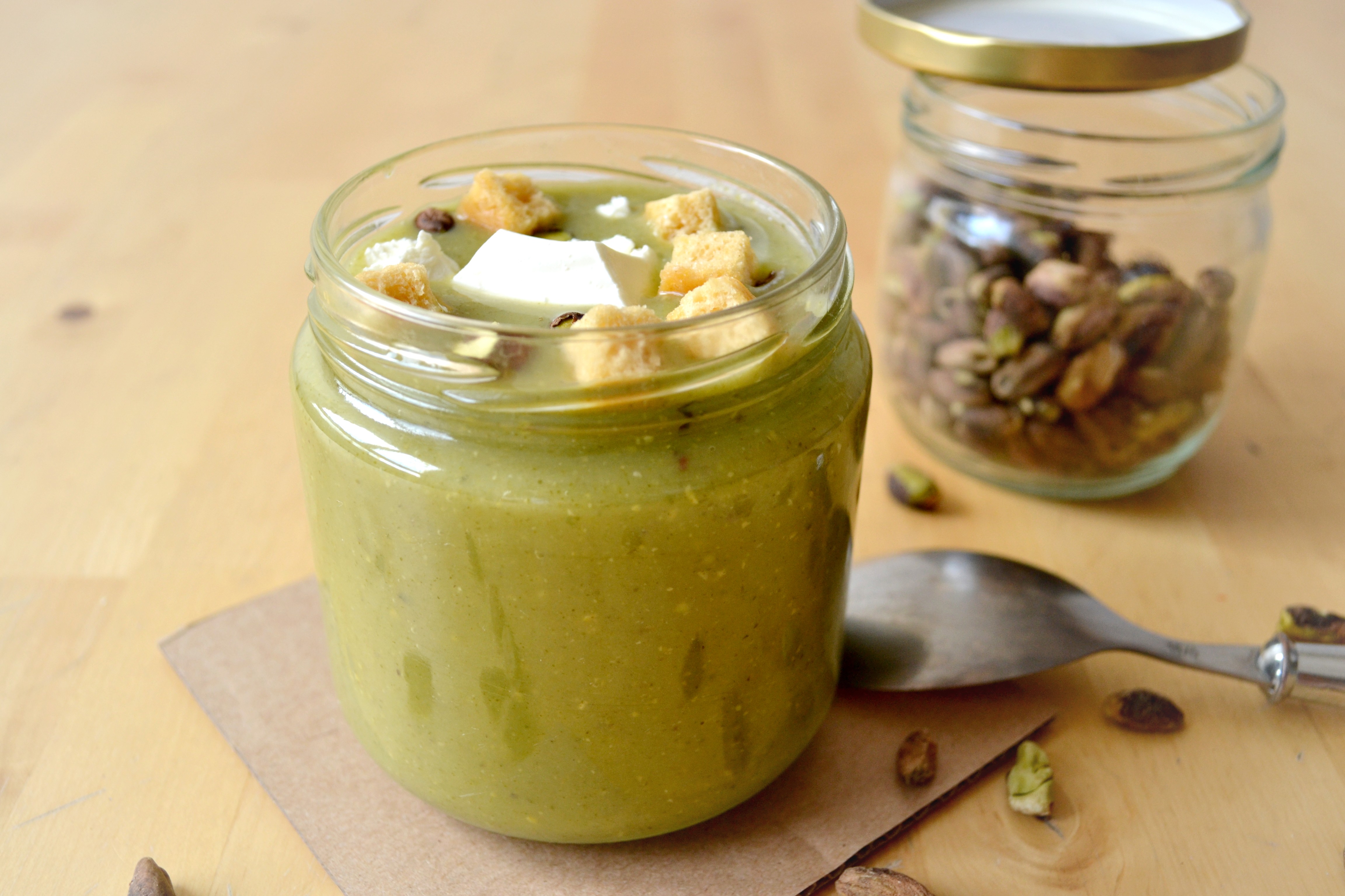 Retirer la casserole du feu puis mixer. Ajouter ensuite les pistaches et mixer à nouveau.