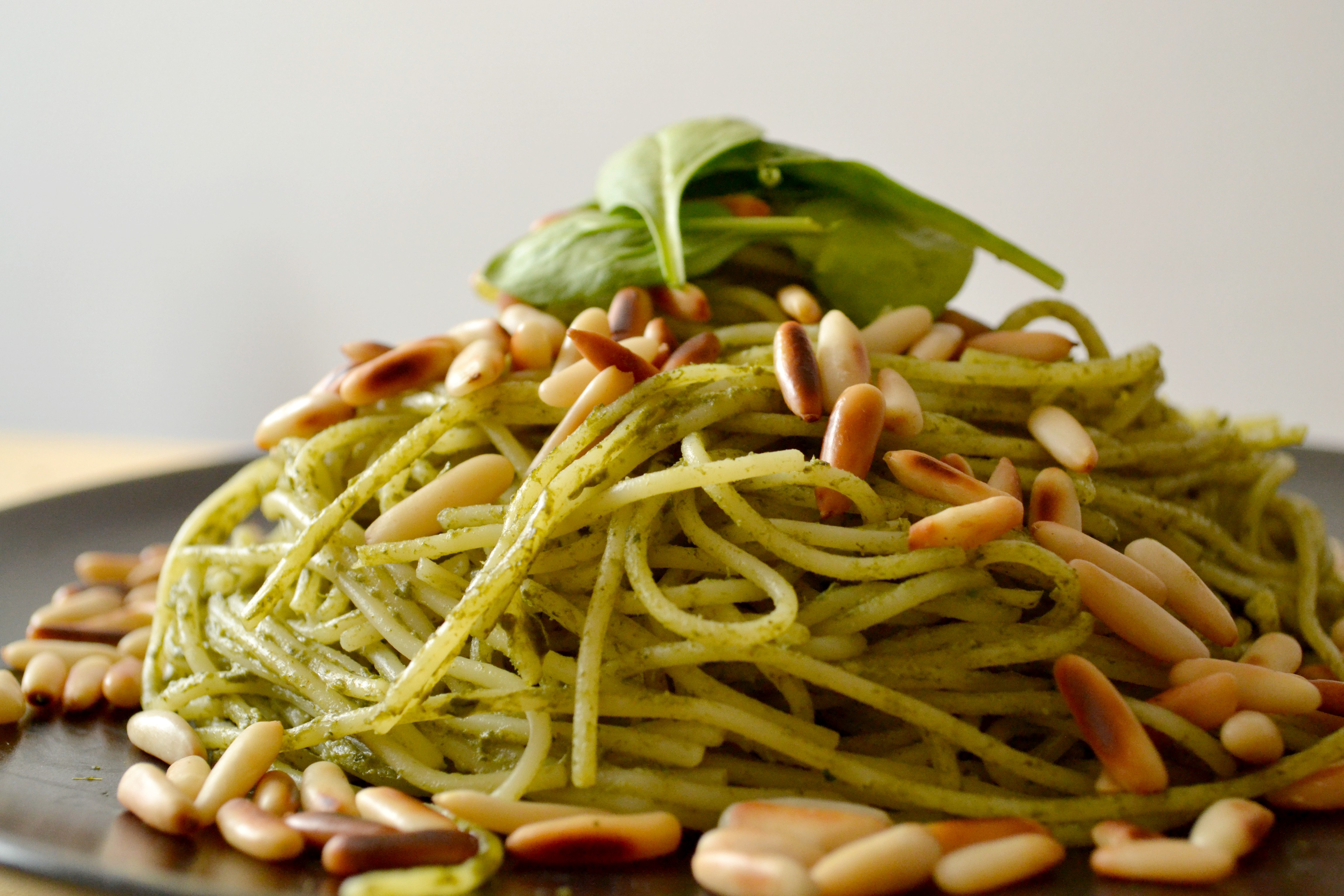 Faire griller les pignons de pin à sec dans une poêle pendant quelques seconde et les servir avec les spaghetti.