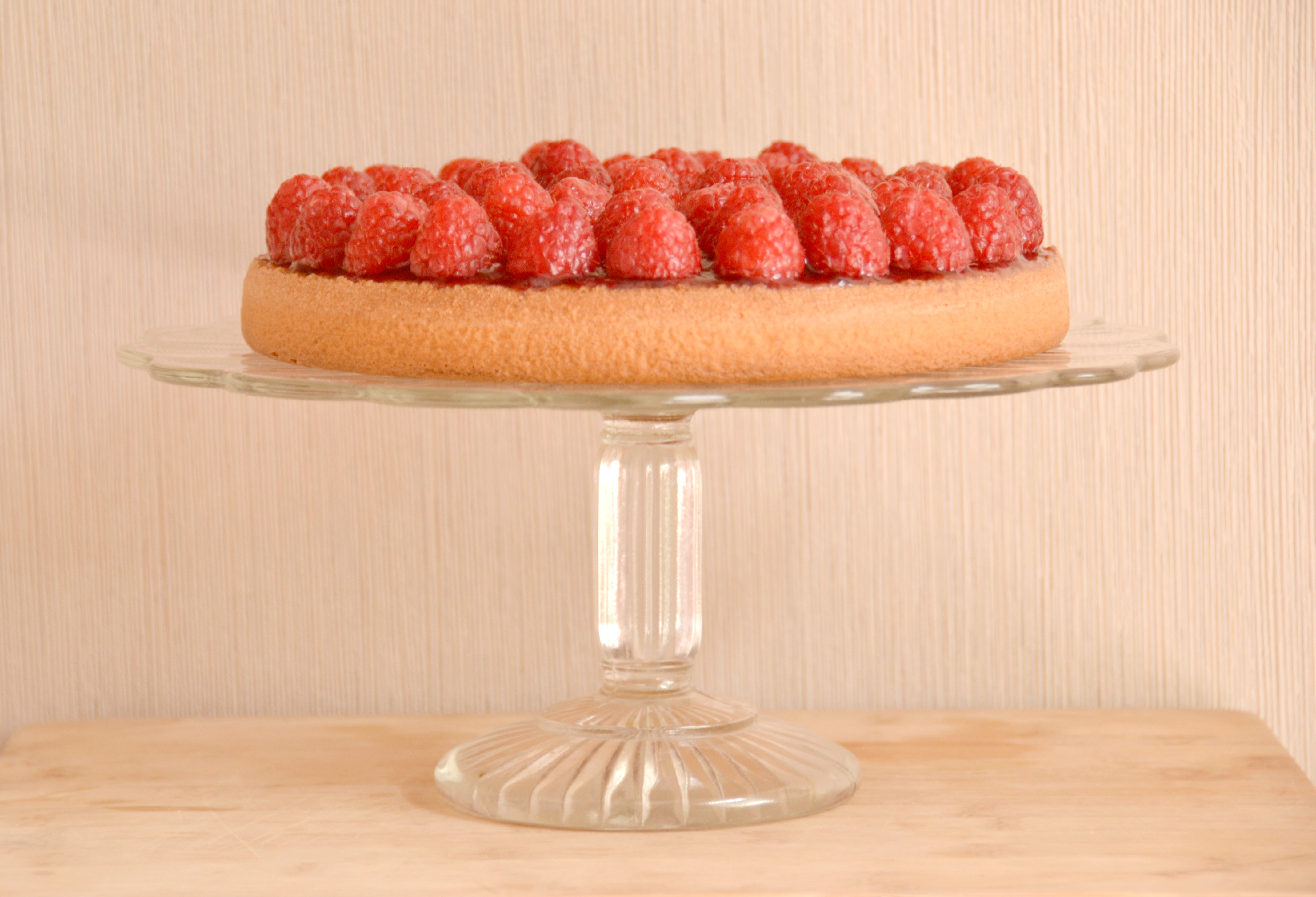 Une fois votre génoise sortie du four et bien refroidie, la recouvrir d’une couche de gelée de framboises ou de groseilles puis disposer joliment les framboises sur le dessus.