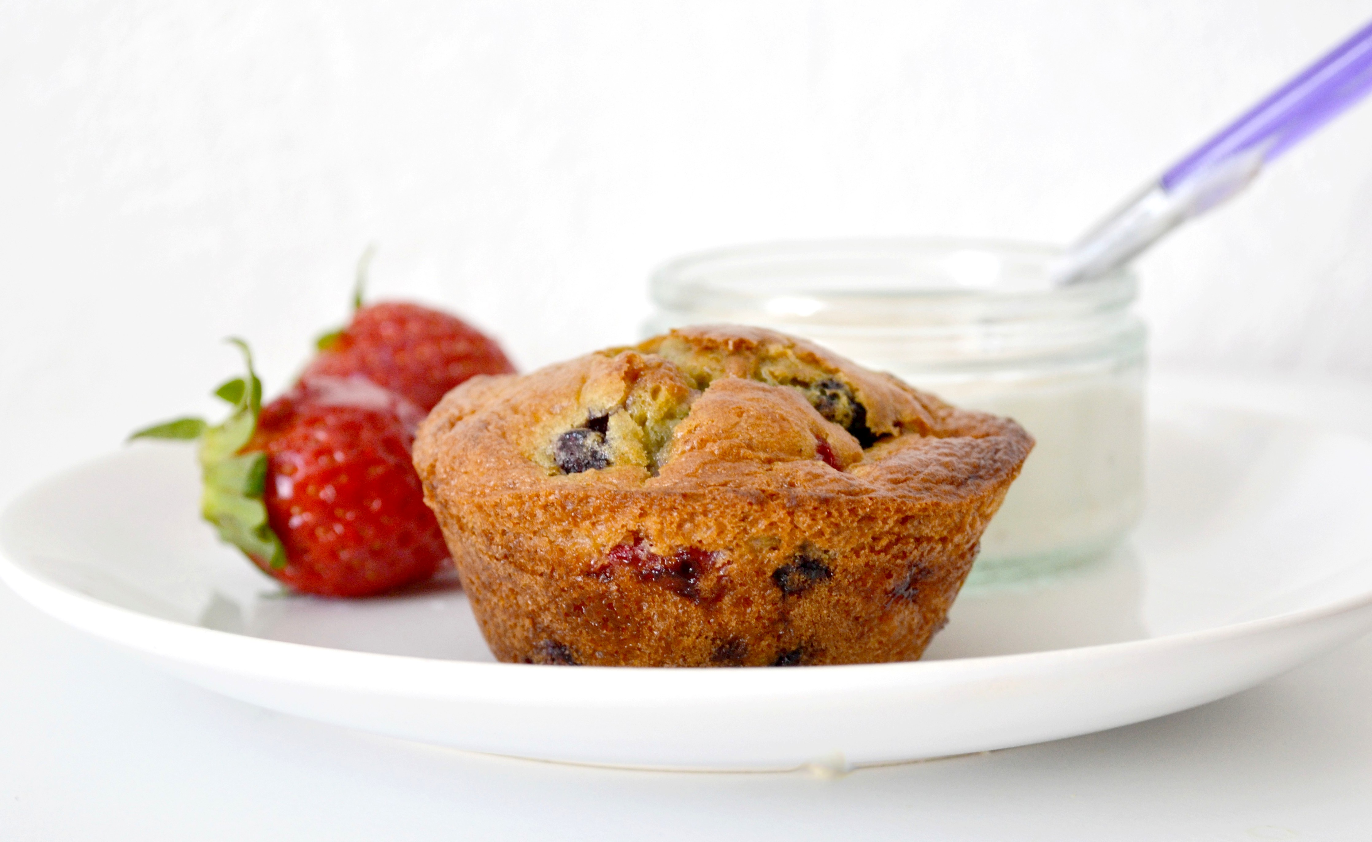 Pauline est à la fête en ce moment puisque cette recette est à nouveau tirée de ses petits carnets. Des muffins tout moelleux et tout doux, aux fruits rouges et au chocolat blanc … Il en faut vraiment peu pour être heureux ! Et servis comme ici avec le yaourt brassé aux figues et au miel de chez Monoprix apporté par MC et quelques fraises fraîches, c’était très difficile de résister … :)