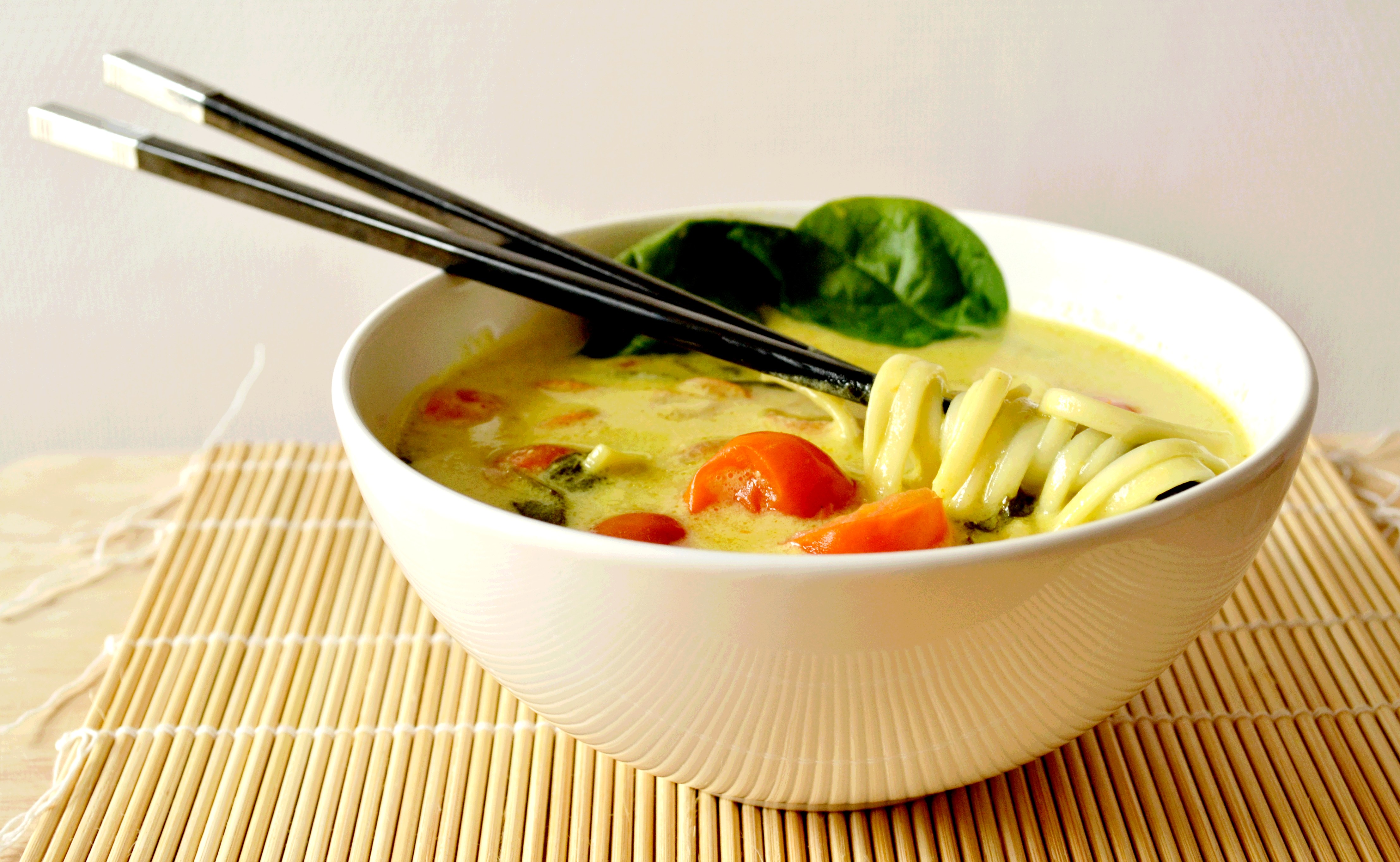 Avec une journée pluvieuse comme aujourd’hui, quoi de mieux qu’une bonne soupe pour se réchauffer ? Et qui plus est, une soupe pleine de chaleur et de saveurs ! Aujourd’hui j’ai en effet testé une nouvelle recette de bouillon thaï, le Khao Soy. Et vous savez à quel point j’aime ça ! Il s’agit d’une soupe de poulet et de légumes à base de curry jaune et de lait de coco. On la sert surtout dans le Nord de la Thaïlande et c’est aussi beau que sain !