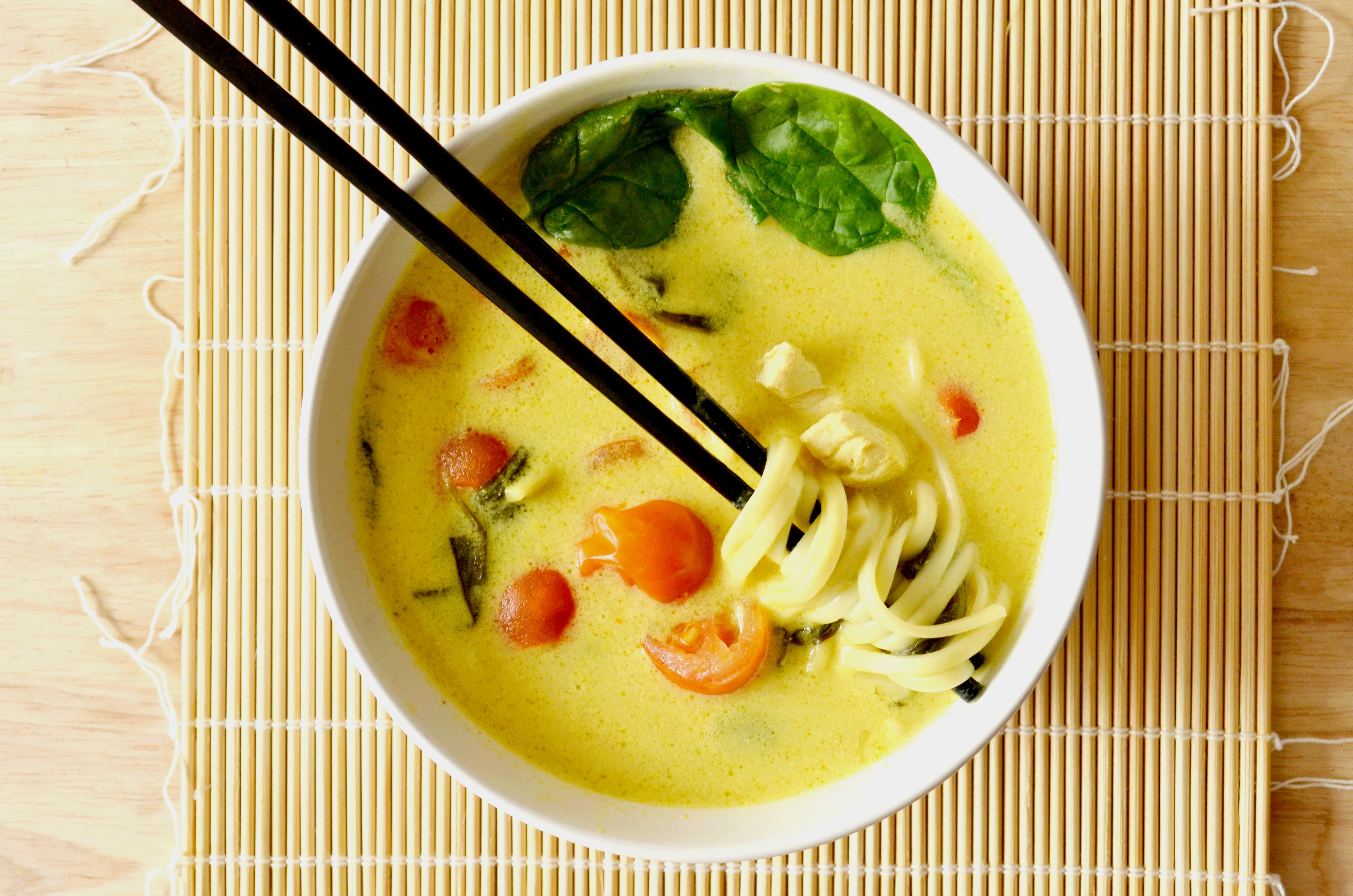 Je me suis inspirée de la recette proposée par le tout nouveau Grand Livre de la Cuisine du Monde aux éditions Hachette (ma nouvelle Bible ♥), vous m’en direz des nouvelles ! C’est un vrai délice ! L’essentiel est de bien réussir le bouillon, au lait de coco, curry jaune et combava (un petit agrume acidulé et au goût très particulier) dans lequel il suffit de laisser cuire quelques nouilles de riz, du poulet et des petits légumes (tomates, épinards …). Décollage illico garanti pour l’Asie du Sud Est !