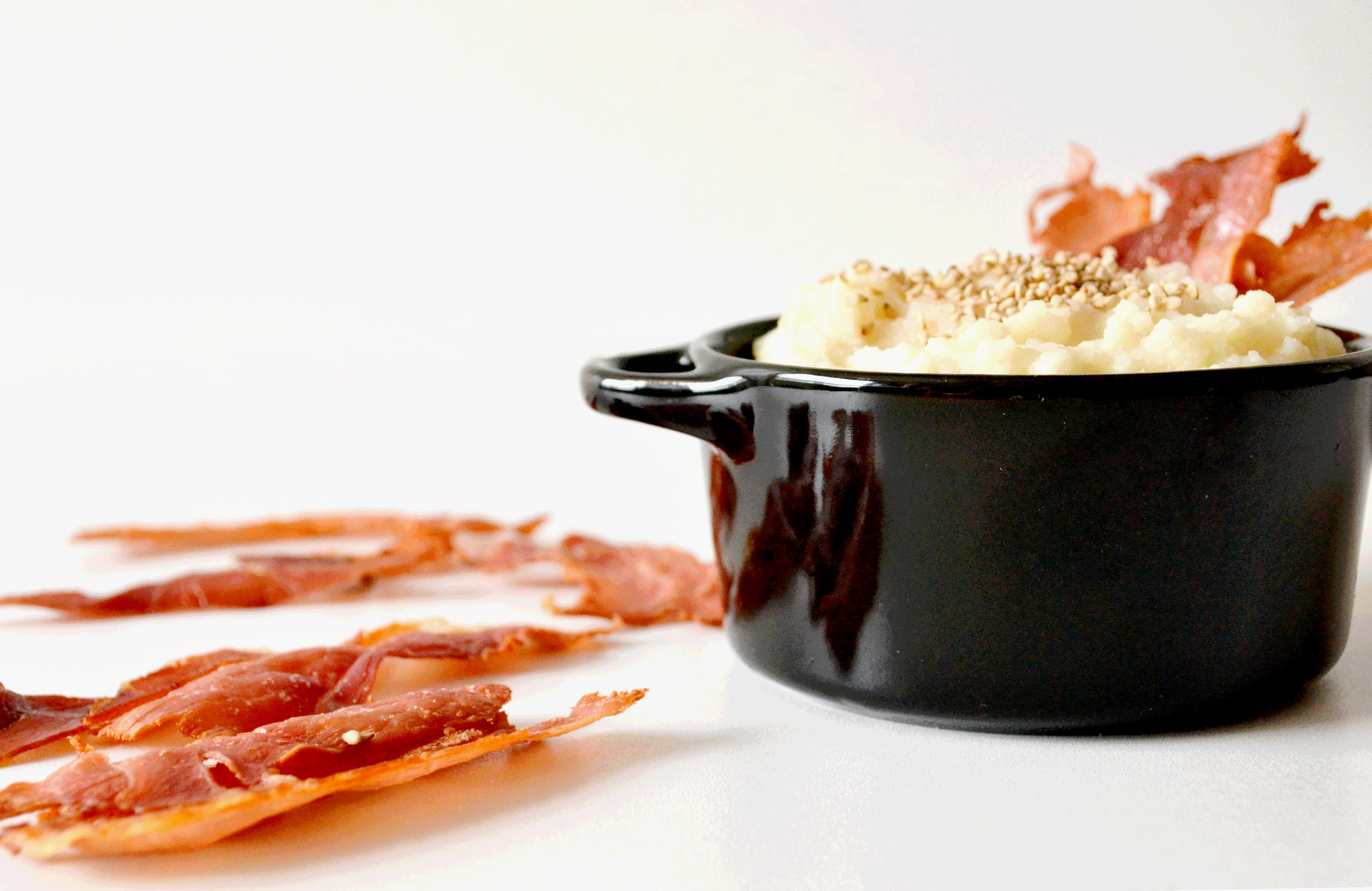 Commençons donc ce programme par cette petite crème de céleri au sésame accompagnée de ses chips de jambon cru. C’est une recette ultra simple et parfaite pour la saison. En effet, le céleri rave est un légume d’hiver naturellement riche en vitamines et en phosphore, très peu calorique et donc idéal pour se remettre des excès des fêtes. Associé au sésame, source de vitamine E, de fibres, de magnésium et de fer, il serait également un très bon fortifiant. Le jambon cru, notamment le jambon de Serrano, est quand à lui riche en protéines ; en plus, en le réduisant en chips, on élimine une bonne partie des acides gras qu’il contient. Ce petit repas semble donc parfait pour débuter cette phase de remise en forme tout en se faisant plaisir, c’est ça le plus important ! :)