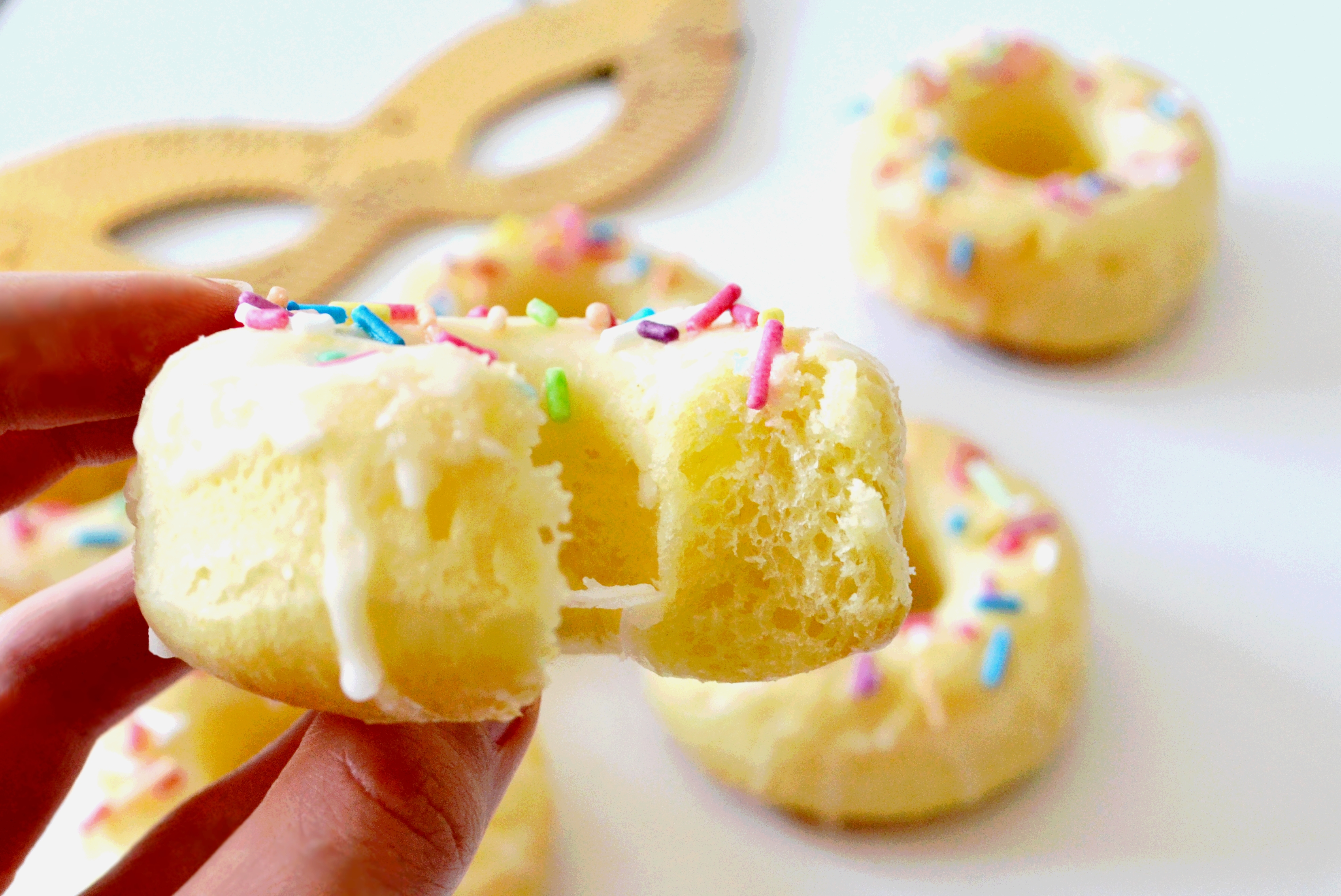 6. A la sortie, démouler immédiatement les donuts et les placer sur une grille. Les glacer à l’aide d’un pinceau avec le sucre glace dilué dans quelques gouttes d’eau, de jus de citron ou de fleur d’oranger (j’ai choisi cette troisième option). Répartir par dessus les sprinkles colorés. Laisser sécher.