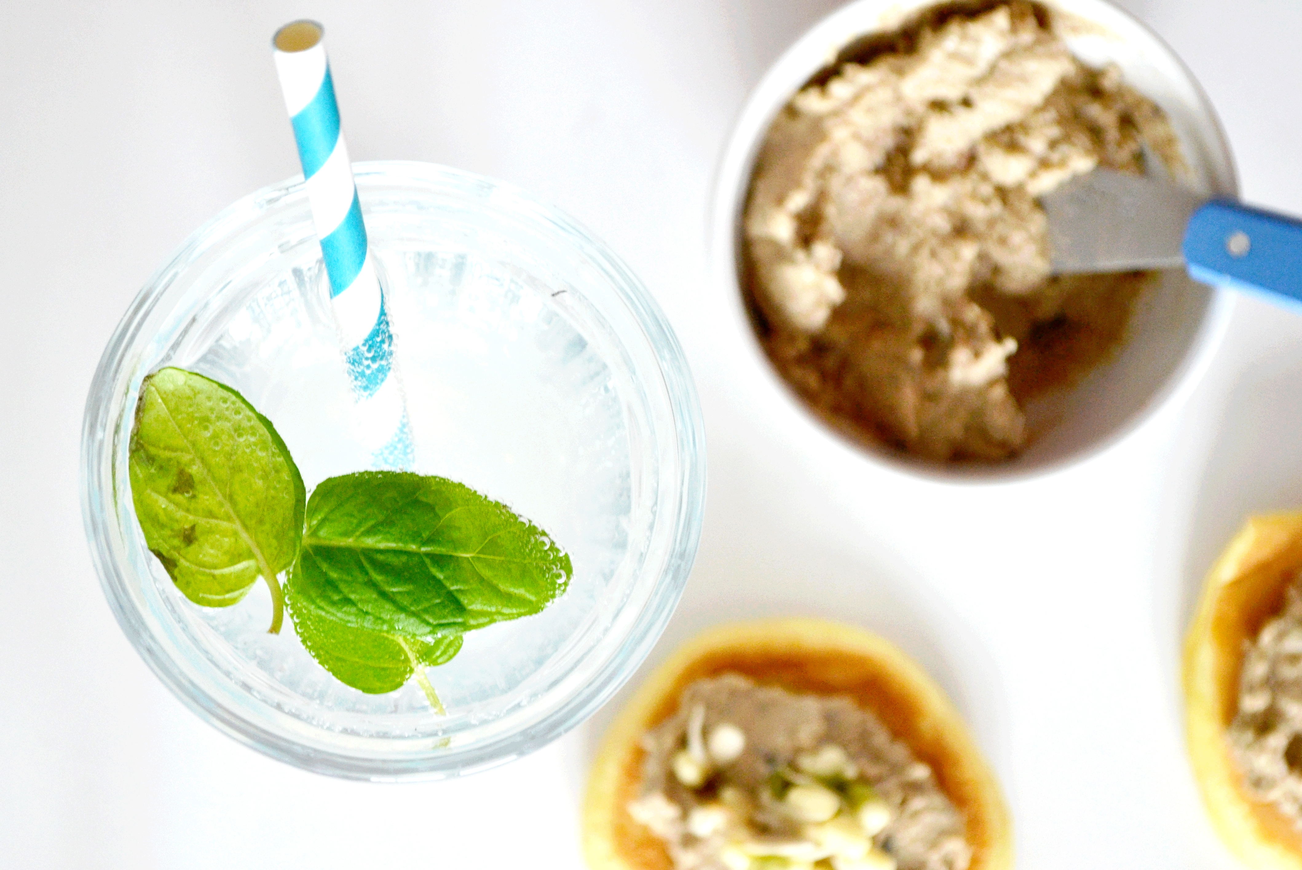 La bouchée étant à la fête aujourd’hui, j’ai décidé de nous projeter immédiatement à l’heure de l’apéro avec une recette d’inspiration méditerranéenne et orientale : de petits blinis au cumin et au lait de brebis, généreusement garnis d’une crème d’aubergine aux dattes et de graines citronnées. Pour la photographie, j’accompagne le tout d’une citronnade à la menthe pour plus de fraîcheur et d’acidité. On peut également envisager de servir ces bouchées avec un cocktail alcoolisé à base de citron ou de citron vert.