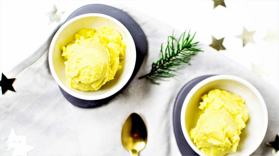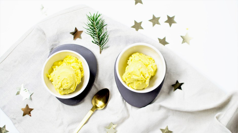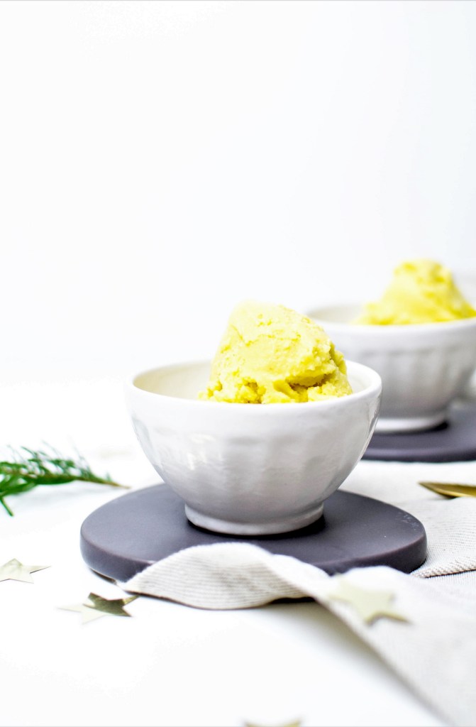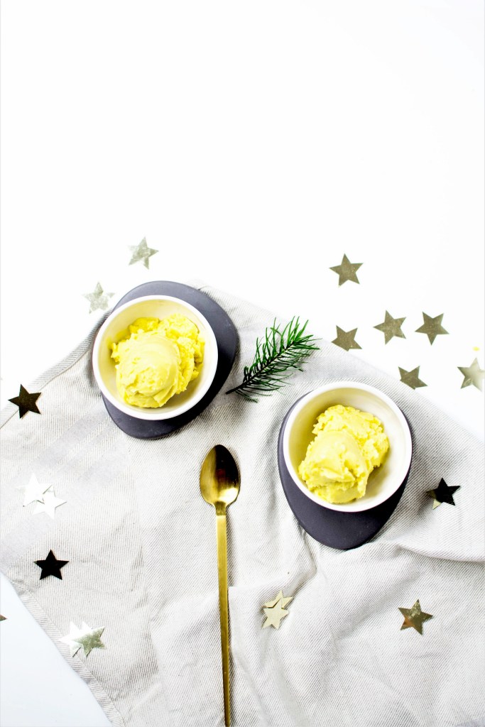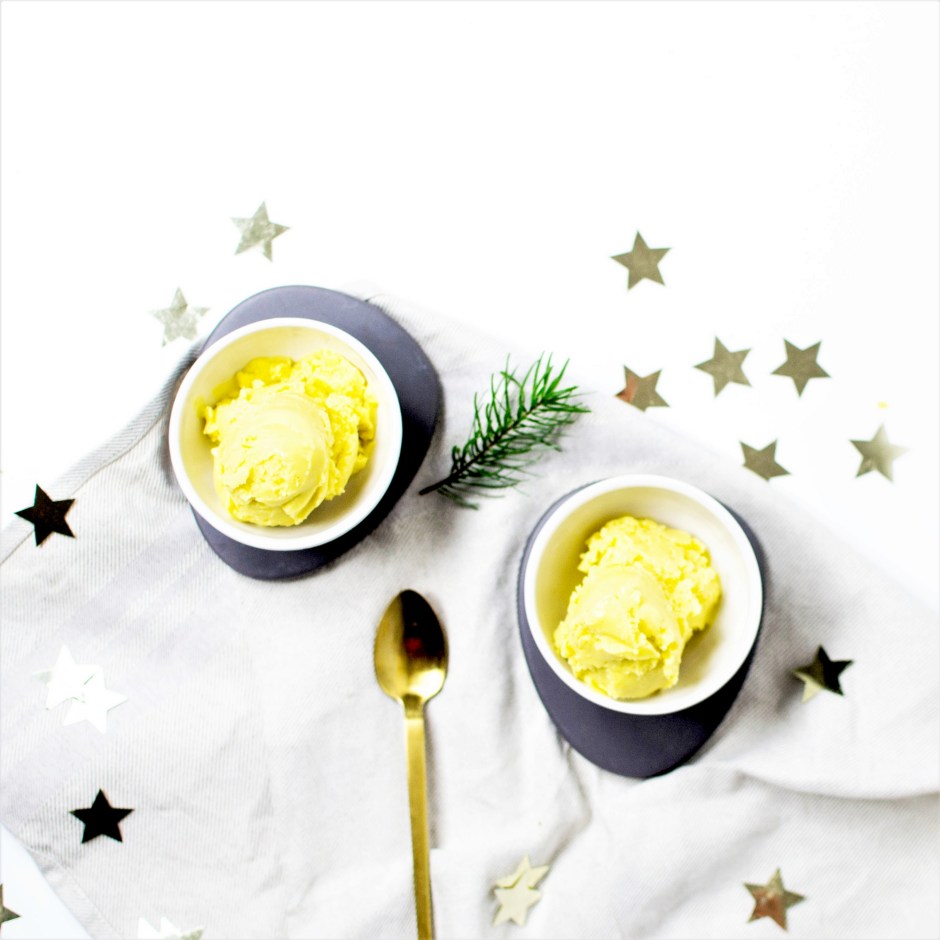 C’est parti, le compte à rebours avant les fêtes est enclenché, et comme je vous le disais hier, le blog va un petit peu transformer les couleurs de Noël. Pour ma première recette, j’ai choisi la simplicité, mais avec des saveurs festives et qui changent de l’ordinaire. Cette glace à la mangue, au lait de coco, au citron et au gingembre n’a vraiment rien à envier aux glaces industrielles. Elle est onctueuse, facile à manier et toutes les saveurs ressortent parfaitement. Je la conserve au congélateur dans un moule à cake pour pouvoir former plus facilement mes boules. On peut également facilement l’intégrer à un entremet lorsqu’elle sort de la sorbetière.