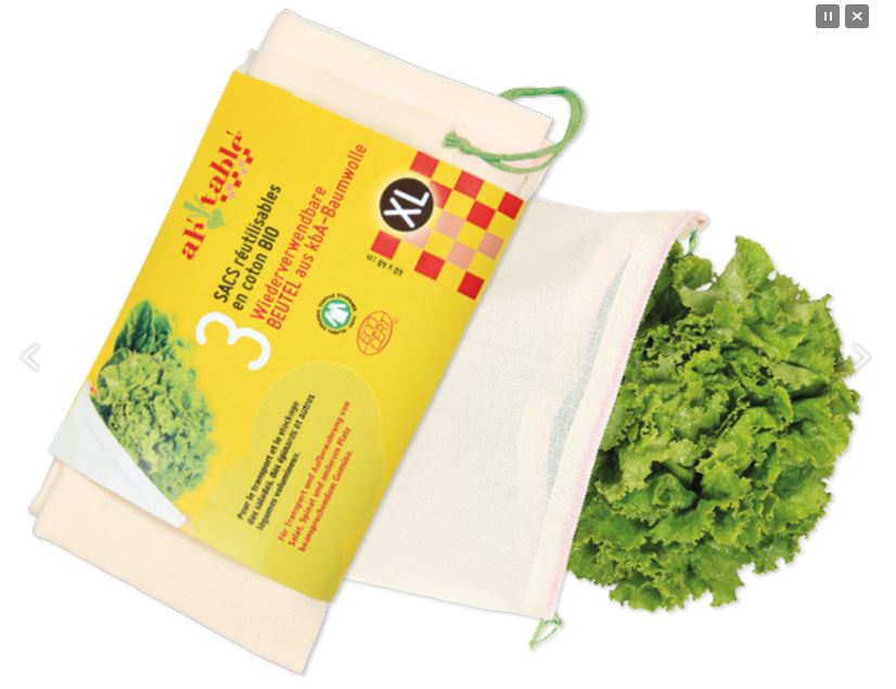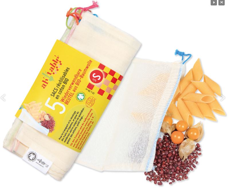 Il existe également de petits sacs en toile de coton pour les achats en vrac, les fruits et légumes. J’utilise ceux de la marque AhTable, très pratiques et disponibles en de nombreux formats. On peut les laver à la machine sans problème, et ils sont très légers (pas de risque de payer plus chers vos fruits et légumes).