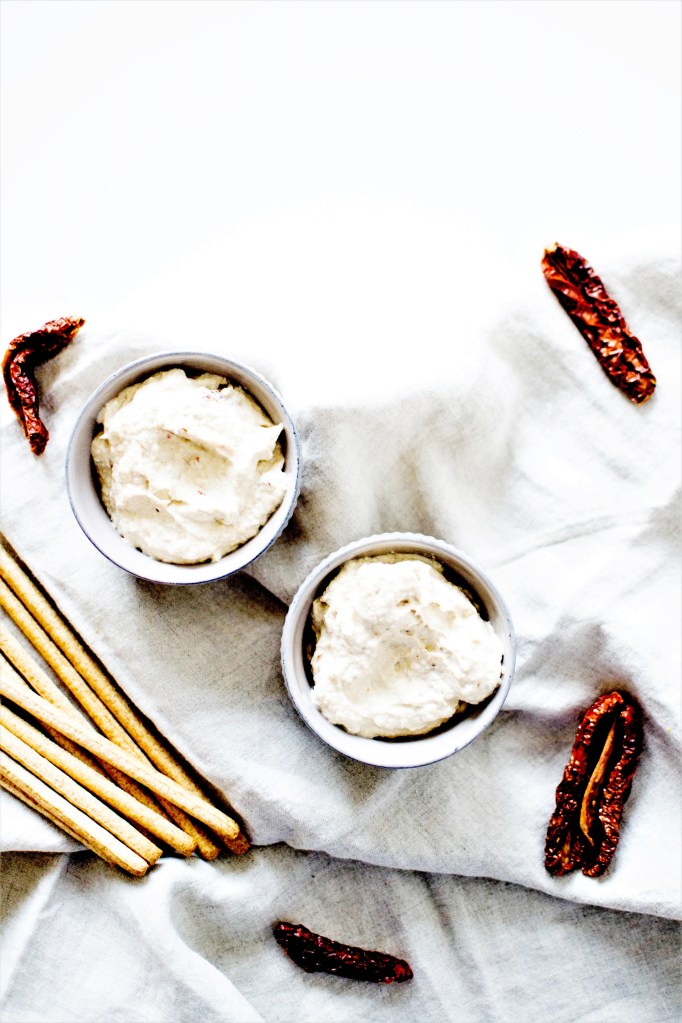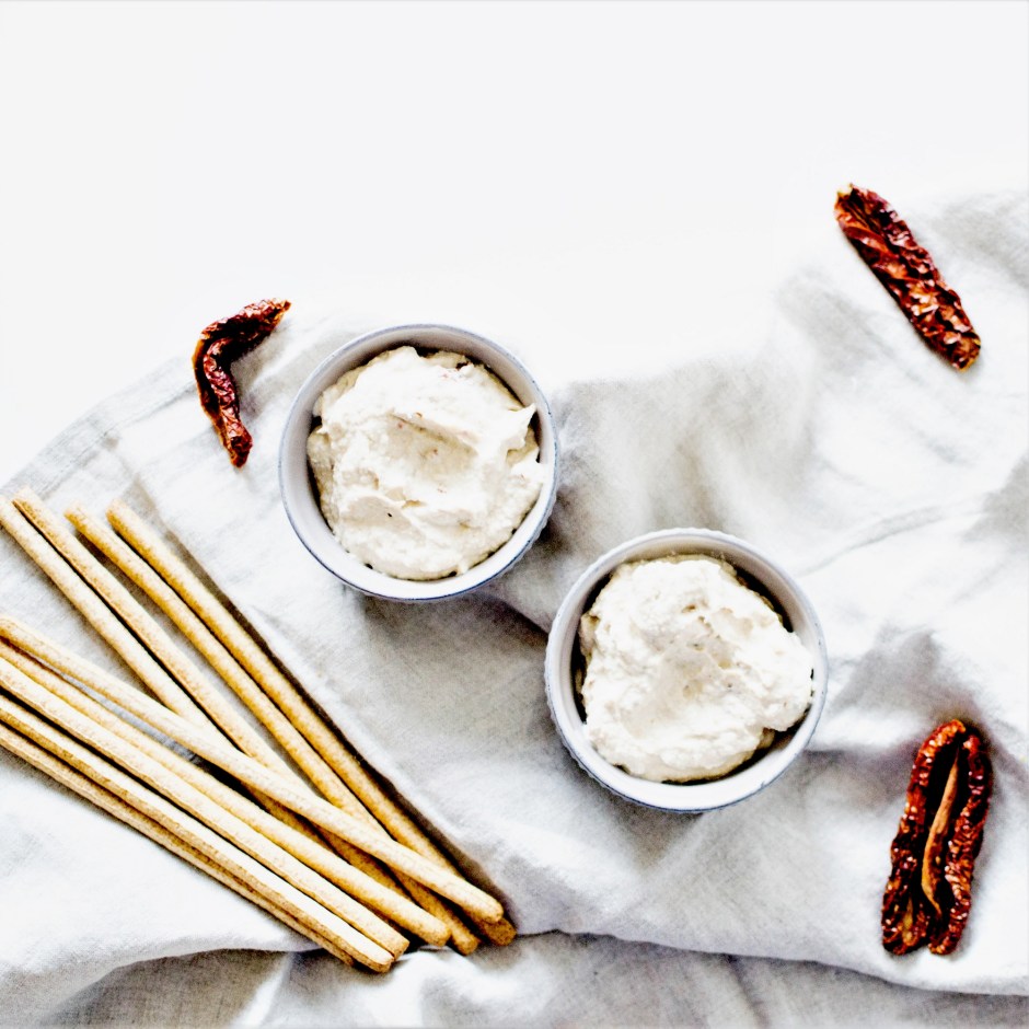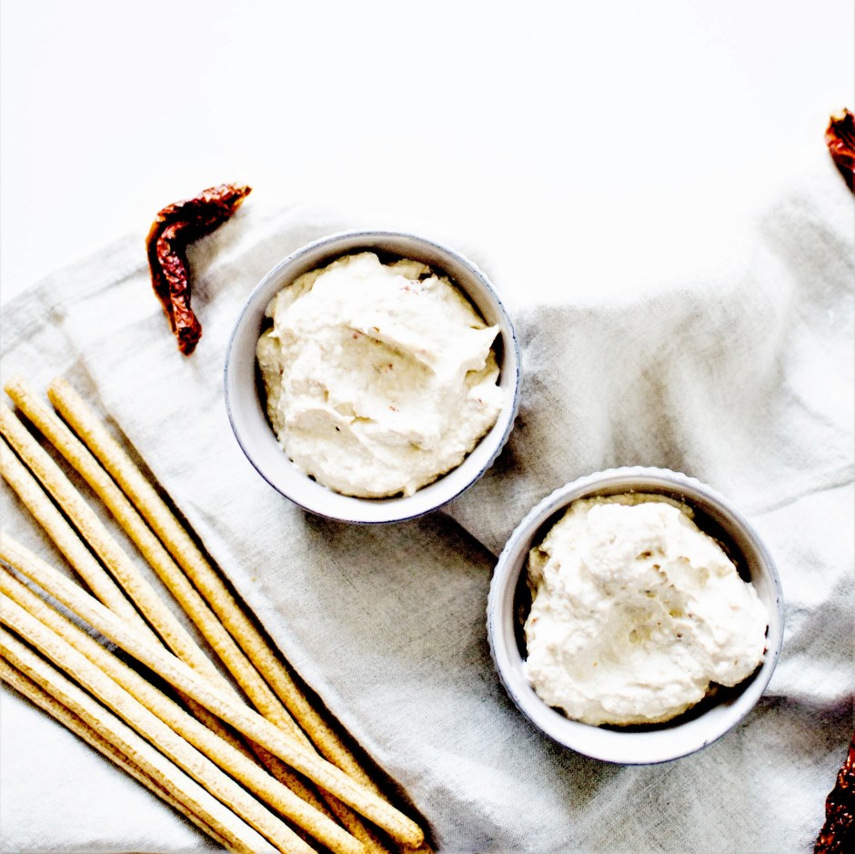 Pour les tomates séchées, j’utilise des tomates complètement déshydratées qu’on peut trouver dans les boutiques de vrac. Je les préfères à celles qui baignent dans l’huile. Mais si vous n’avez que ça, aucun problème. Il suffit de les essuyer un peu avant de les ajouter à la préparation. De même pour la gousse d’ail. Si vous ne digérez pas l’ail cru, remplacez-le par une gousse d’échalote ou supprimez la carrément, cela n’altérera pas le goût de la tartinade, les tomates séchées étant déjà un ingrédient très parfumé.