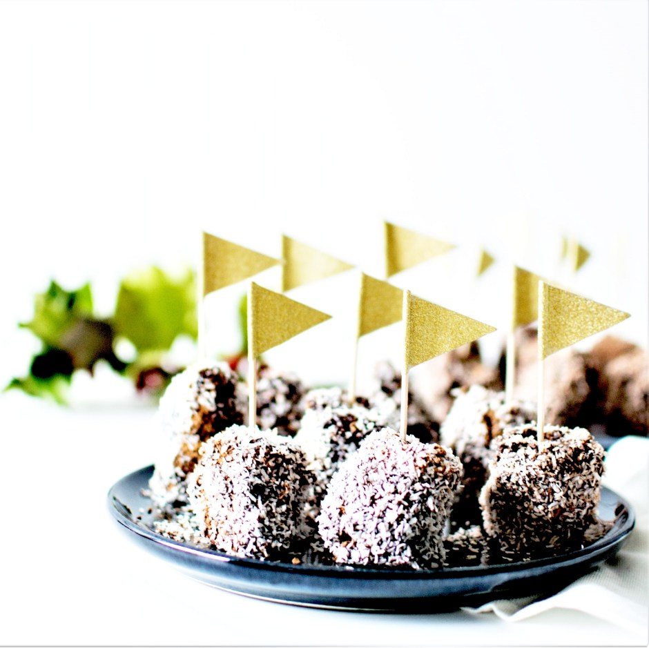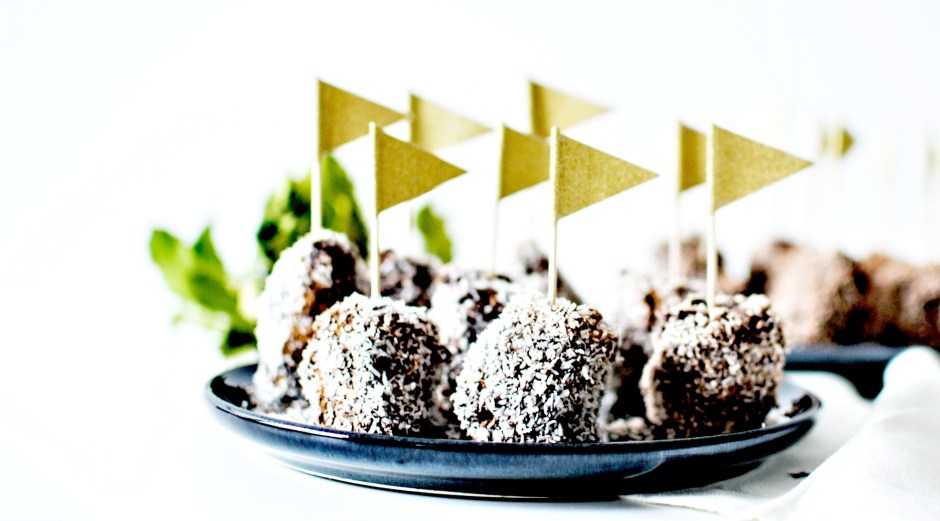 Les rouler dans le chocolat fondu, puis dans le cacao, et enfin dans la noix de coco. Déposer sur une assiette et piquer avec un cure-dents pour la prise en main.