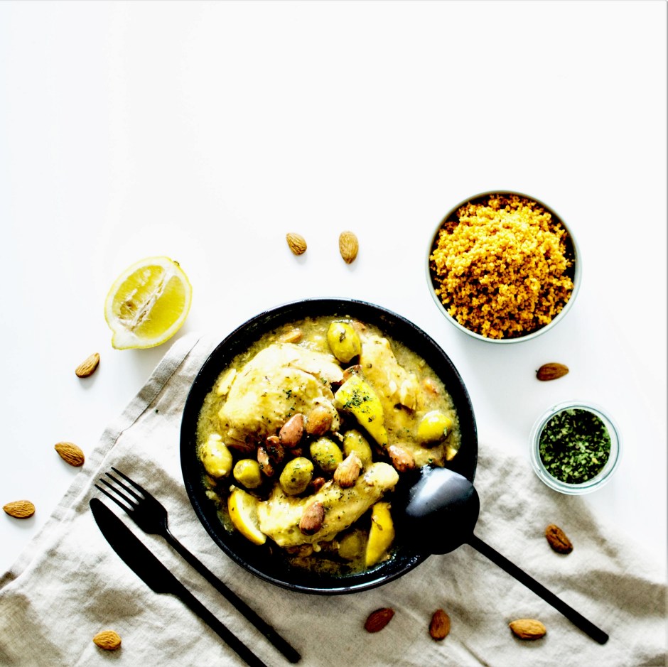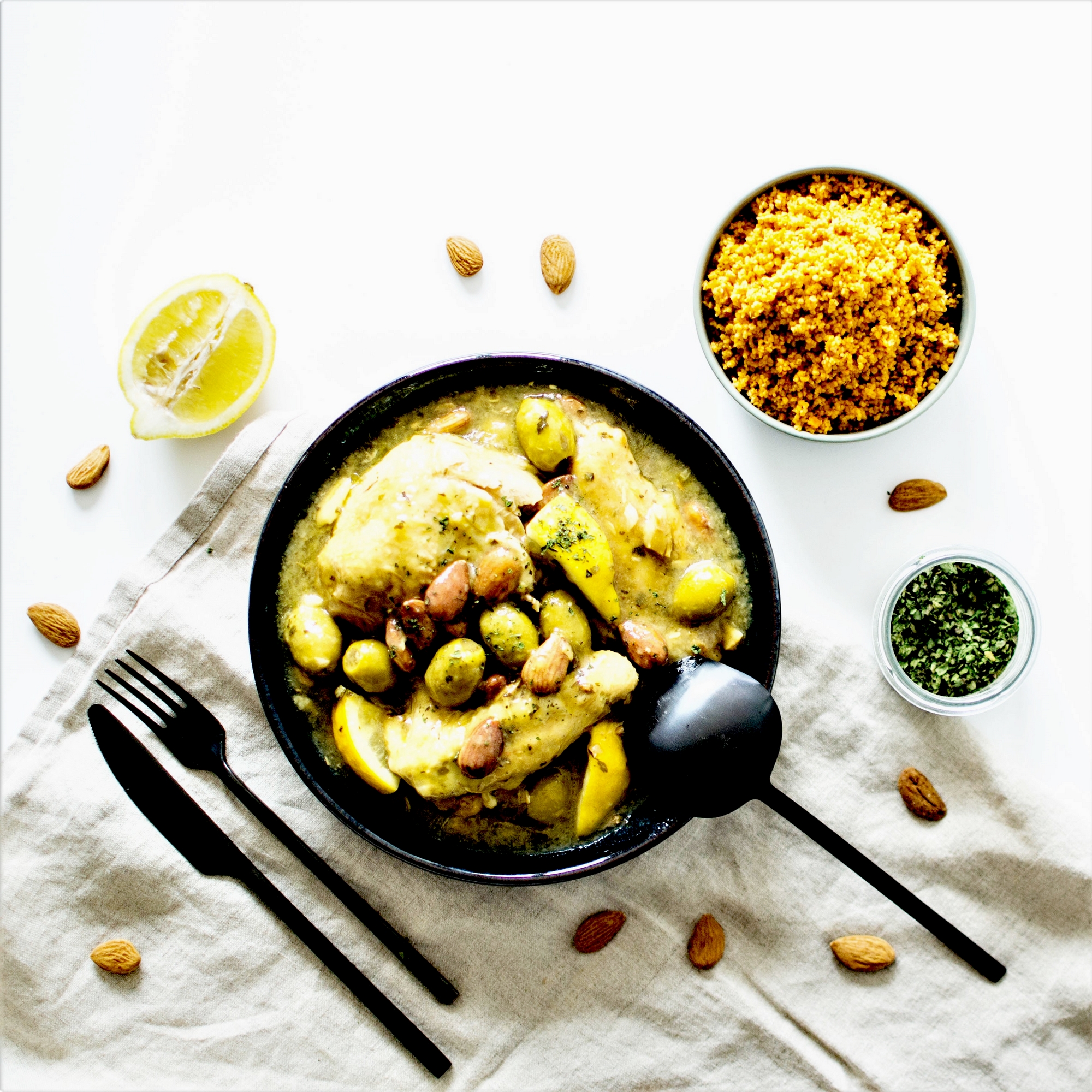 Cette recette de tajine est très facile à réaliser, ses ingrédients sont communs et faciles à trouver et l’on peut n’y mettre que des produits bio. J’y ai utilisé des citrons frais plutôt que des confits car je n’en avais pas, et leur goût est tout aussi prononcé. Les amandes apportent du croquant et le mélange d’épices vous propulsera direct en Orient.