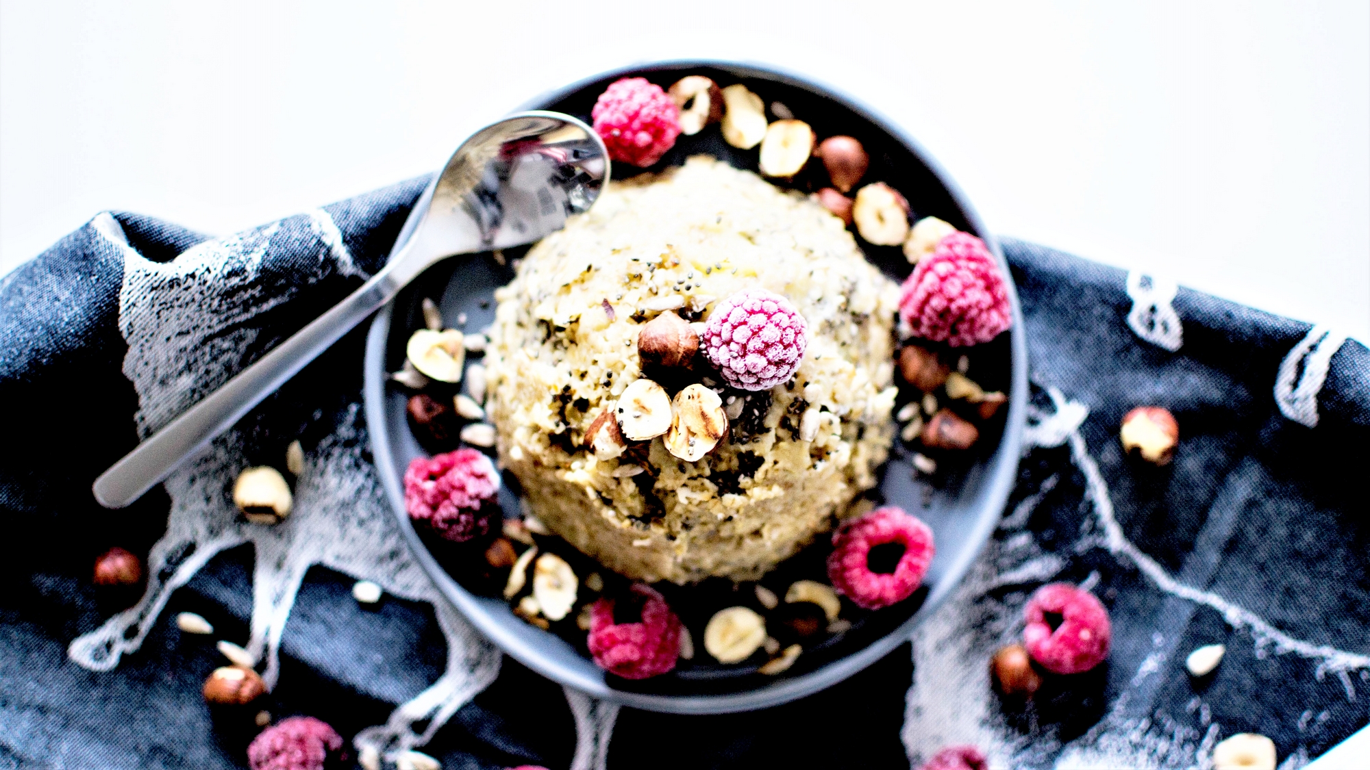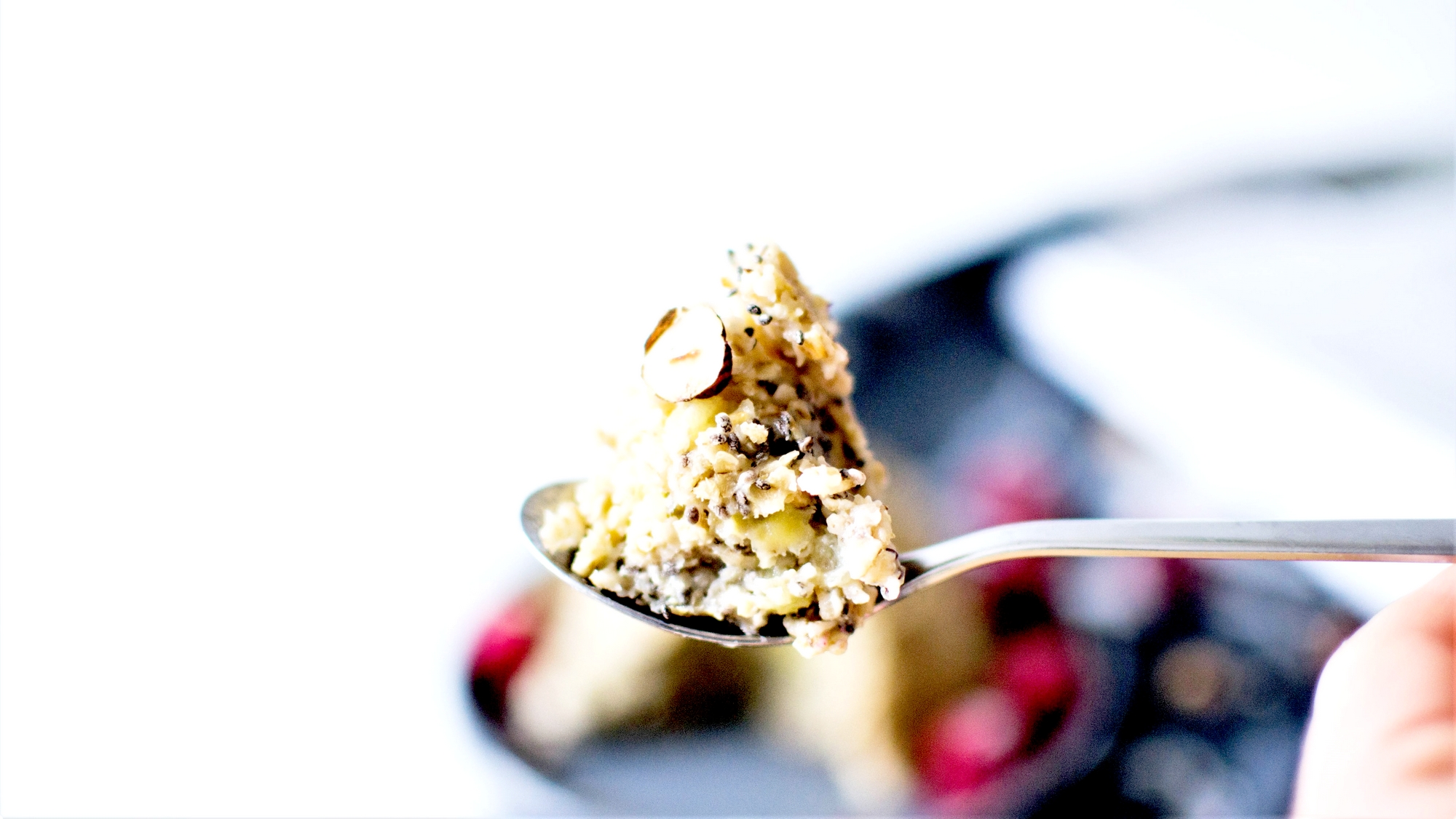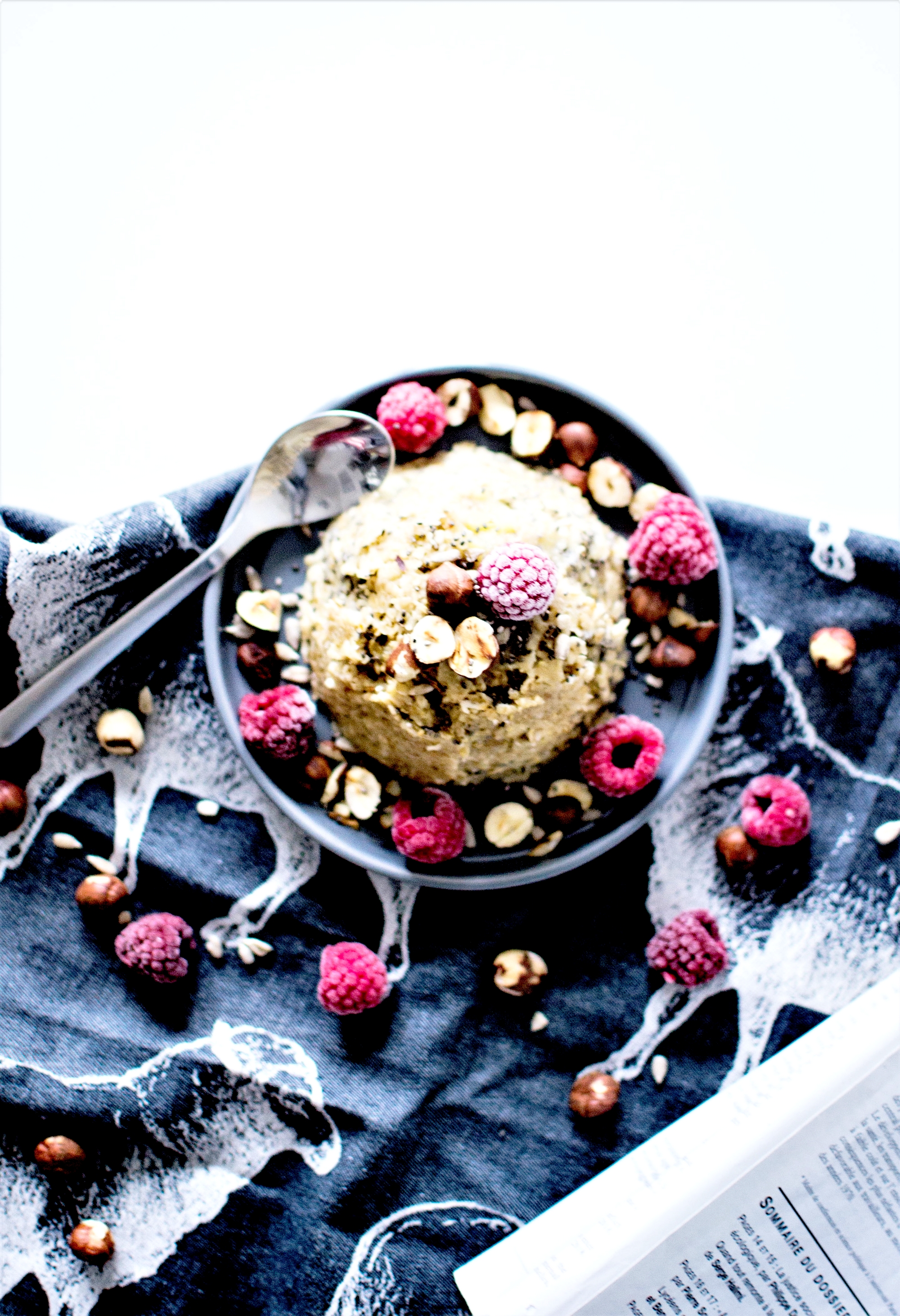 Ça faisait un moment que je voulais tester ce concept. J’avoue que n’y voyais pas beaucoup d’intérêt, les ingrédients pour la version vegane étant à peu de chose près les mêmes que ceux du porridge. Mais je me suis lancée et finalement c’est bien plus intéressant que ce que j’imaginais. La texture plus compacte que celle du porridge est plutôt agréable parce qu’elle reste fondante (sans doute grâce à la banane). On peut en fait y mettre les saveurs que l’on veut, des pépites de chocolat, du lait de coco, de la purée d’amande … les options sont infinies pour un petit déjeuner complet et savoureux. Un bon moyen d’ailleurs pour écouler les fruits un peu trop mûrs. Pensez aussi comme ici à y ajouter des graines pour varier les textures. Pour ma part j’y ai mis des framboises surgelées qu’il me restait de cet été et quelques graines de tournesol.