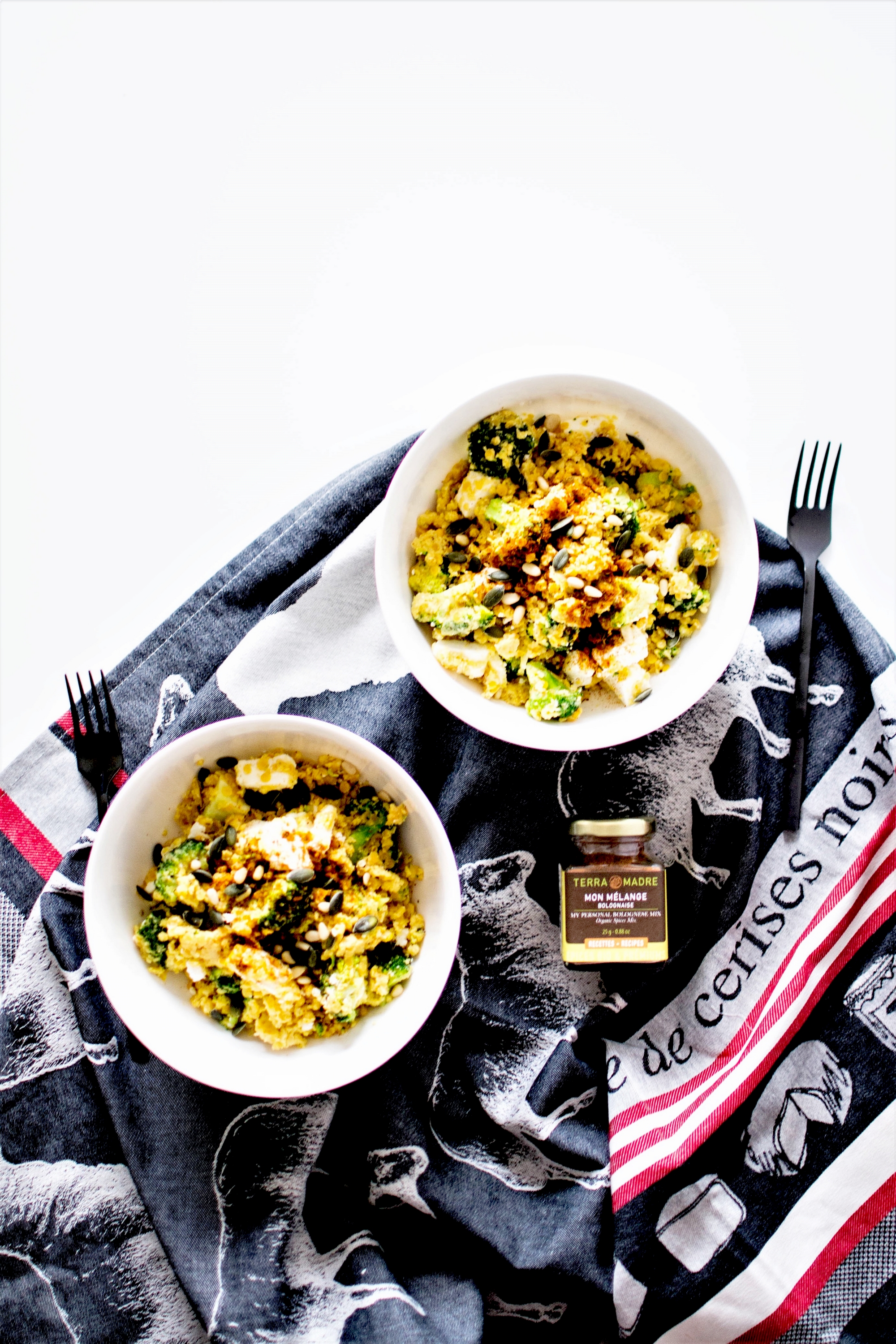En réalité, j’ai créé ce plat vendredi dernier pour tester mes nouvelles épices bio Terra Madre des Jardins de Gaïa … et je l’ai tellement adoré que je l’ai un peu perfectionné ce weekend pour vous en proposer la recette sur le blog. D’ailleurs il faut aussi que je vous parle plus précisément de ces nouveaux mélanges (« Bolognaise », « potatoes », « ratatouille » ou encore « soupe »), 100% bio et vraiment extras. J’ai testé ce plat avec le mélange pour « soupe » vendredi et avec le mélange « bolognaise » cette fois-ci (ba oui pourquoi se formaliser aux étiquettes ?) et j’ai vraiment adoré leur subtilité. D’ailleurs, de manière générale j’achète peu de mélanges d’épices tout faits, je préfère les composer moi-même. Mais j’avoue que ceux-là m’ont vraiment conquise, pour leur couleur, leurs saveurs et surtout leur originalité. Le spécial soupe est plutôt anisé, et se mariera parfaitement avec une soupe de légumes (poireaux, carottes, céleri par exemple), celui pour la bolognaise est plus relevé et sent le Sud à plein né (paprika, piment, cumin). Je l’ai adoré. Je n’ai pas encore testé celui pour potatoes, mas ça ne saurait tarder. Bref, on doit bien reconnaître que les Jardins de Gaïa sont des maîtres du goût et des mélanges, des artistes de la subtilité.