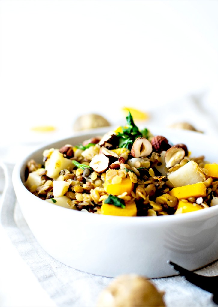 Le lentillesotto (ou risotto de lentilles) est une idée devrait vous plaire. Je vous en avais d’ailleurs déjà proposé une version ici il y a bien longtemps. Sain, généreux, coloré et délicieux, c’est un repas complet, riche en protéines, fibres et vitamines. Son petit goût de vin cuit, sa texture crémeuse grâce à l’ajout de parmesan et ses noisettes croquantes en font un plat gourmand à souhait. On peut évidemment y mettre les légumes de notre choix, au gré des saisons et des envies. Ici j’ai choisi les topinambours et carottes jaunes reçus dans mon panier bio de La Ruche qui dit Oui !. Mais j’aurais parfaitement pu y mettre des poireaux, des choux raves, des carottes, des patates douces, de la courge, des épinards … bref, plein de bonnes choses de saison.