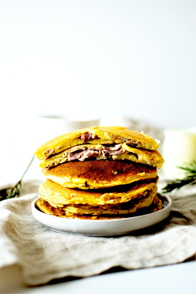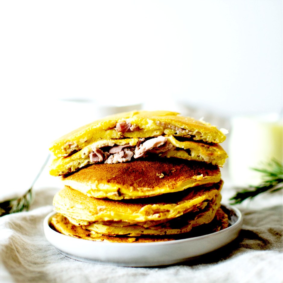 Quoi de mieux pour un brunch que des pancakes gourmands ? Surtout s’ils sont fourrés au jambon et au fromage … :)