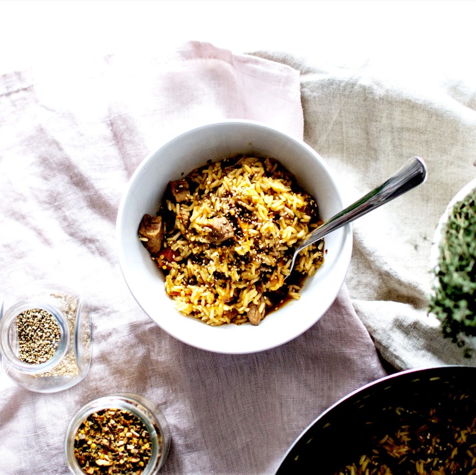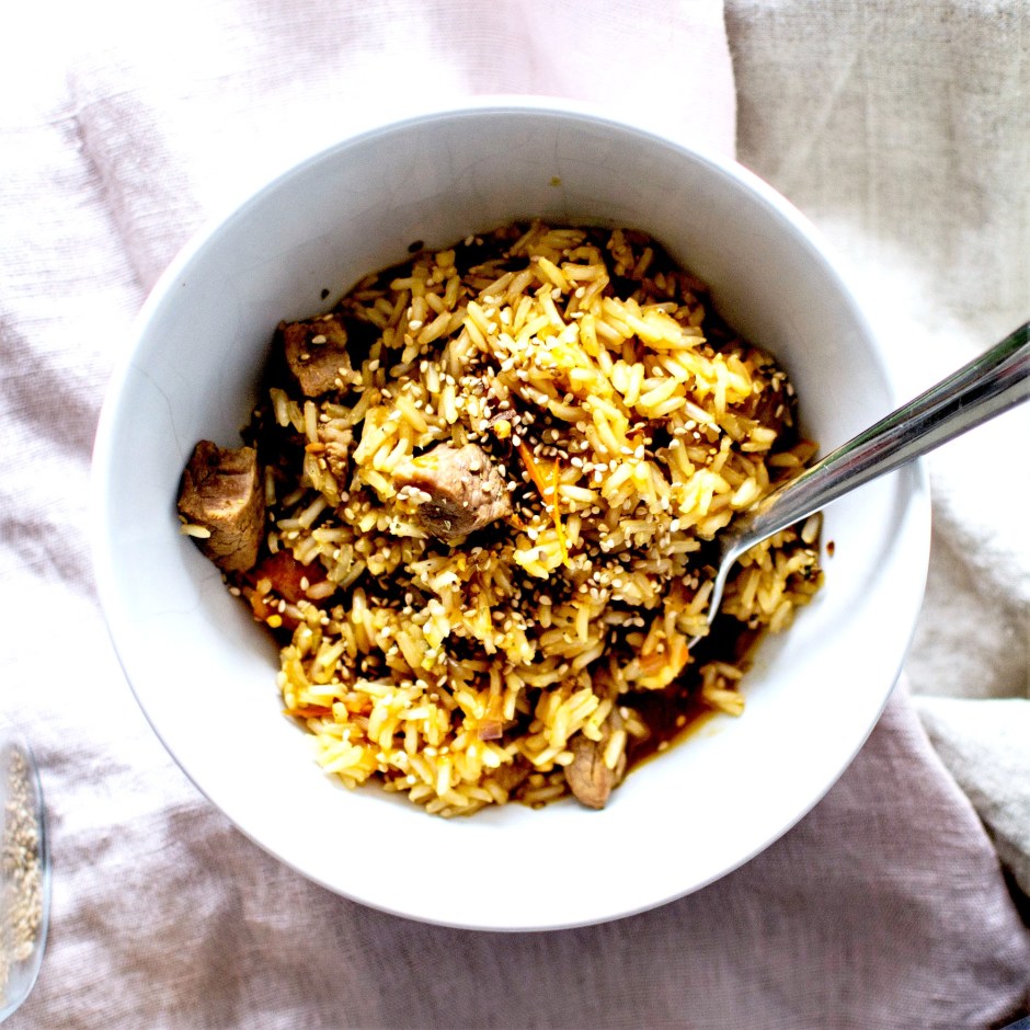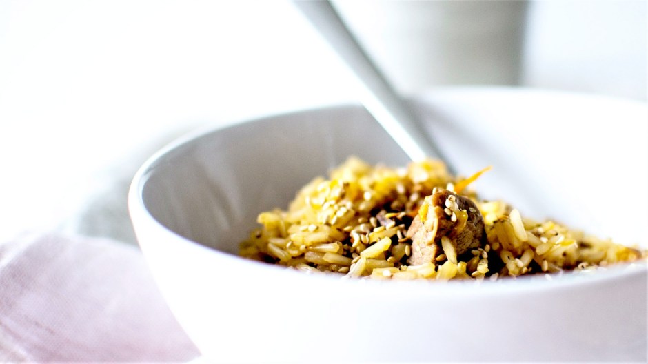 C’est un petit plat que j’ai réalisé pour un lunch sur le pouce la semaine dernier mais avec lequel je me suis régalée. J’ai donc eu envie de vous en partager la recette (vraiment simple pour le coup et qui ressemble à beaucoup de choses déjà publiées ici). C’est plus une idée qu’une vraie recette, vous pourrez remplacer le porc par du poulet ou du tofu fermenté, les tomates par n’importe quel légumes, le sésame par n’importe quelle autre graine. Ce qu’on a aimé surtout c’est la marinade aux épices et à la sauce soja légèrement adoucie par le sirop d’agave. 🙏🏼 Bref, encore une belle recette.