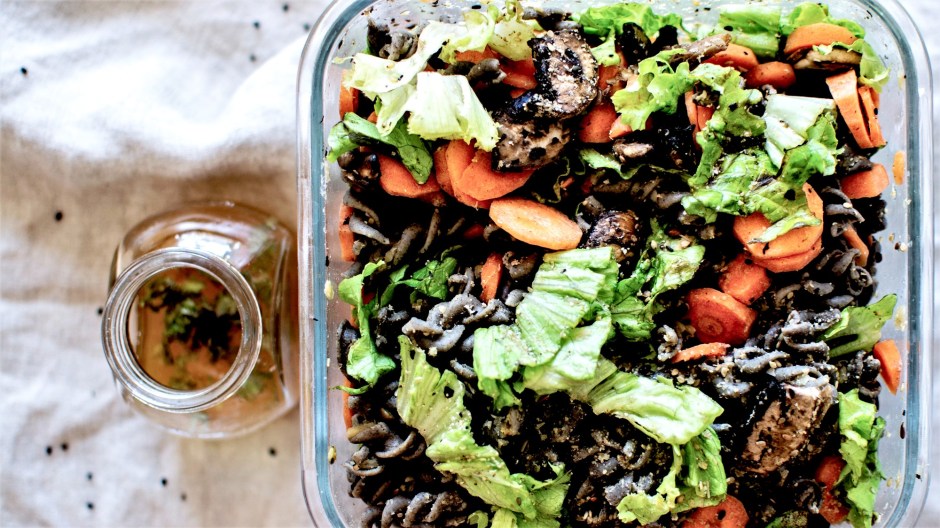 J’ai utilisé ici les pâtes aux lentilles achetées en vrac dans ma boutique Day by Day Strasbourg. J’adore leur couleur, leur texture un peu farineuse et surtout leur goût assez prononcé de lentilles. Je les ai associées (comme souvent en ce moment) à une vinaigrette à l’huile de sésame grillé : combo parfait. On peut évidemment y mettre les légumes que l’on veut, selon les arrivages et les saisons. Ici j’y ai simplement mis quelques champignons de Paris, des carottes et de la batavia. J’ai complété le tout avec des graines de lin, de sésame noir, du gomasio et des herbes fraîches. Un régal … :)