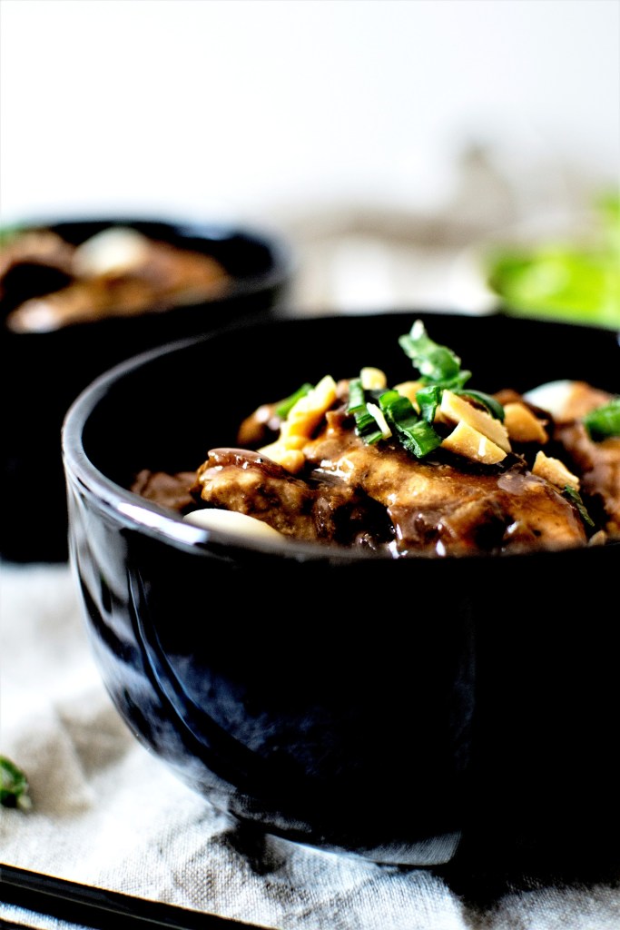 NB : Servir avec des nouilles ou du riz, et parsemer de quelques cacahuètes et morceaux de tige d’oignons nouveaux pour le croquant et la déco.