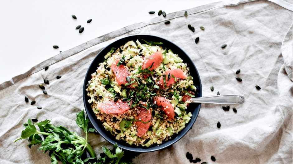 Vous aimez le pamplemousse en salade ? Cette recette est faite pour vous. Avec de bons légumes verts de saison (céleri branche, concombre …), de la menthe, des graines et surtout du boulgour, elle devrait plaire pour son peps et sa fraîcheur. Une salade qui se suffit à elle-même mais qui pourra aussi accompagner vos barbecues et grillades de l’été.