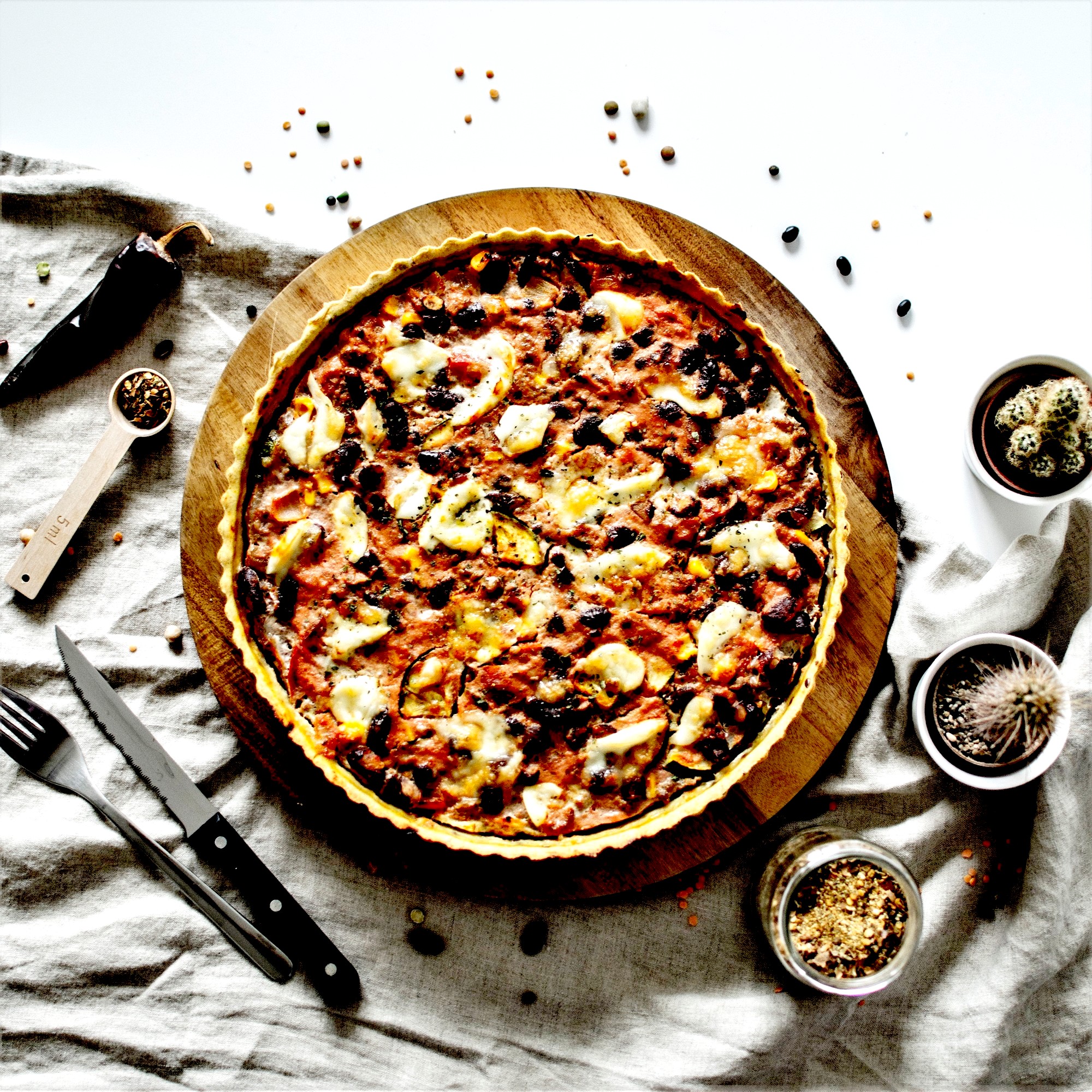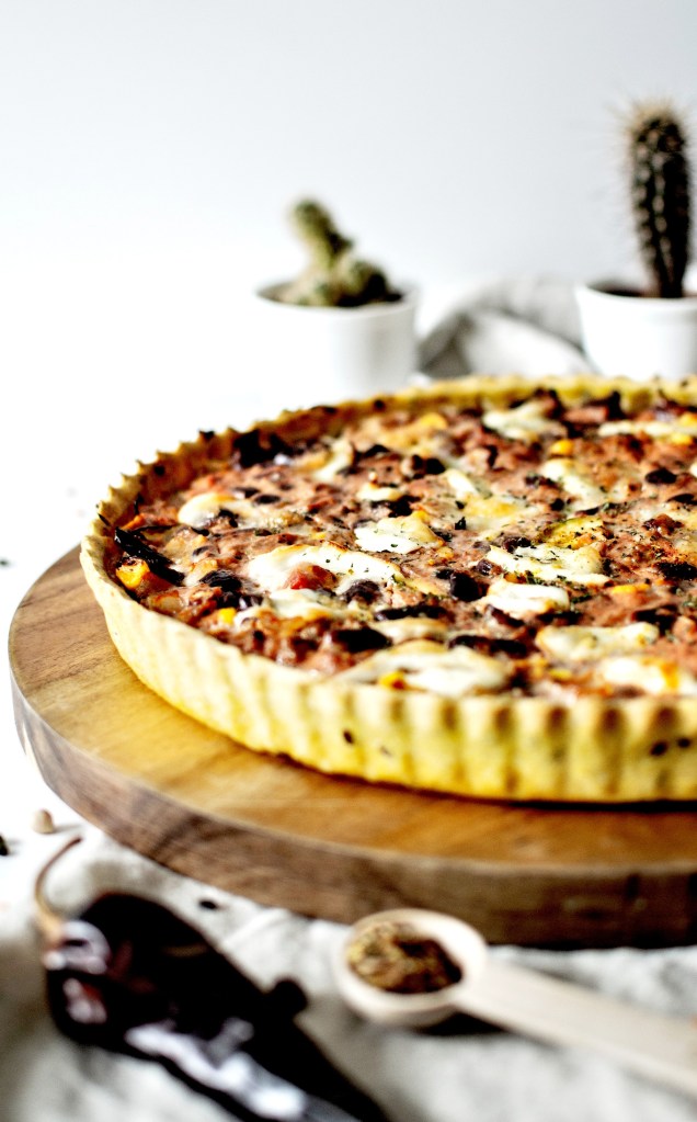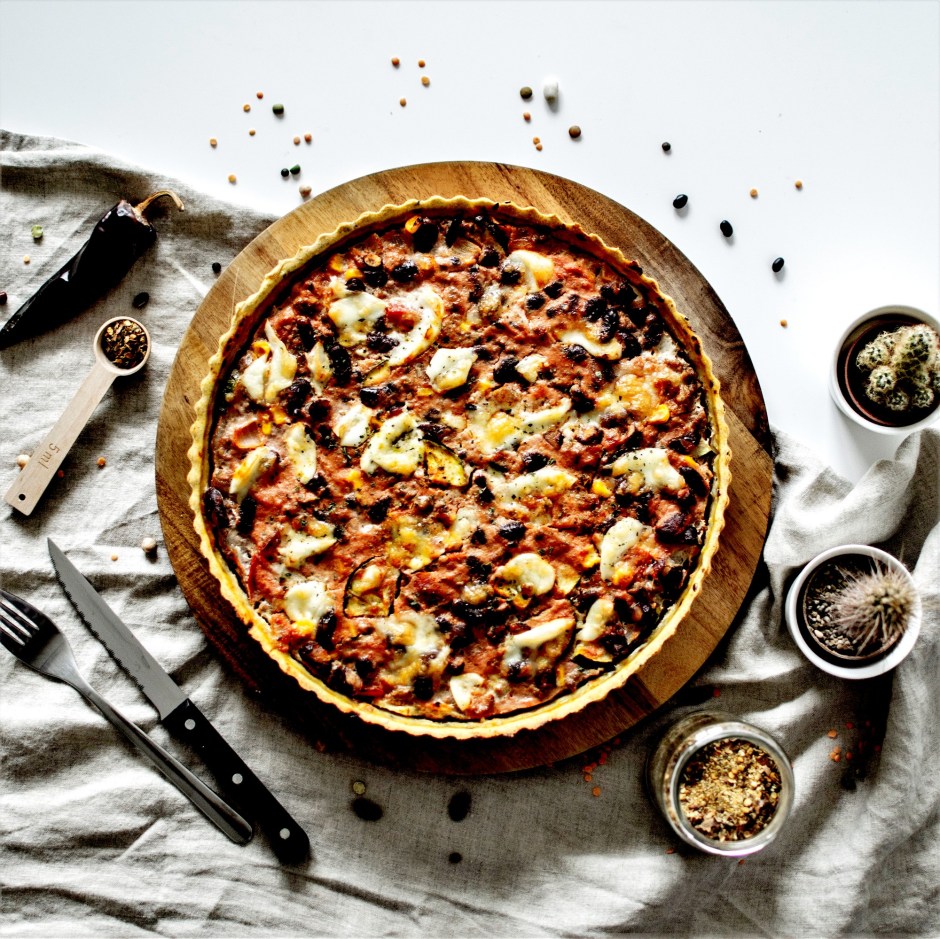 Cette fois c’est donc vers le Mexique je me tourne pour une tarte salée réalisée avec des restes de légumes et de viande, mais aussi des fonds de bocaux. Il me restait des graines de lin brun et de la farine de maïs (pas assez pour en faire un corn bread), et des haricots rouges qui ne me donnaient plus envie par ces températures. Mais avec un peu d’imagination, j’ai pu en faire un repas super sexy, plutôt équilibré et savoureux. On s’est régalé !