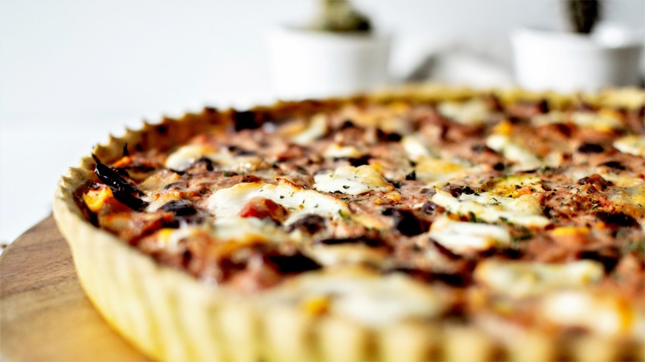 Verser le tout dans le fond de tarte, recouvrir de mozzarella.