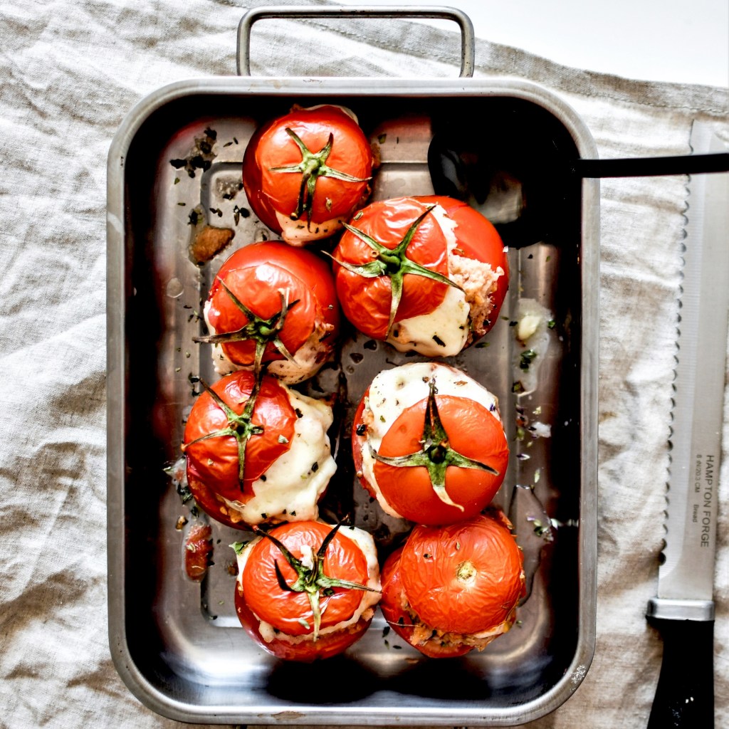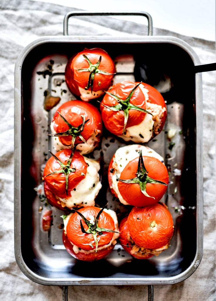 Saler légèrement la peau et le chapeau des tomates. Déposer la farce à base de pain dans chacune d’elle. Recouvrir d’une tranche de mozzarella, refermer avec le chapeau.