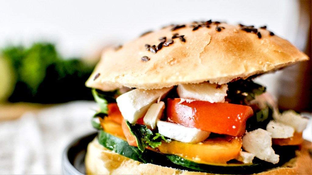 Pour la garniture, j’y ai mis des crudités de saison : concombre, tomate, poivron, persil et un peu de manouri (un fromage de brebis). J’ai réhaussé le tout avec une touche de vinaigre balsamique versée directement sur les pains, un peu de sel et de poivre. Un régal.