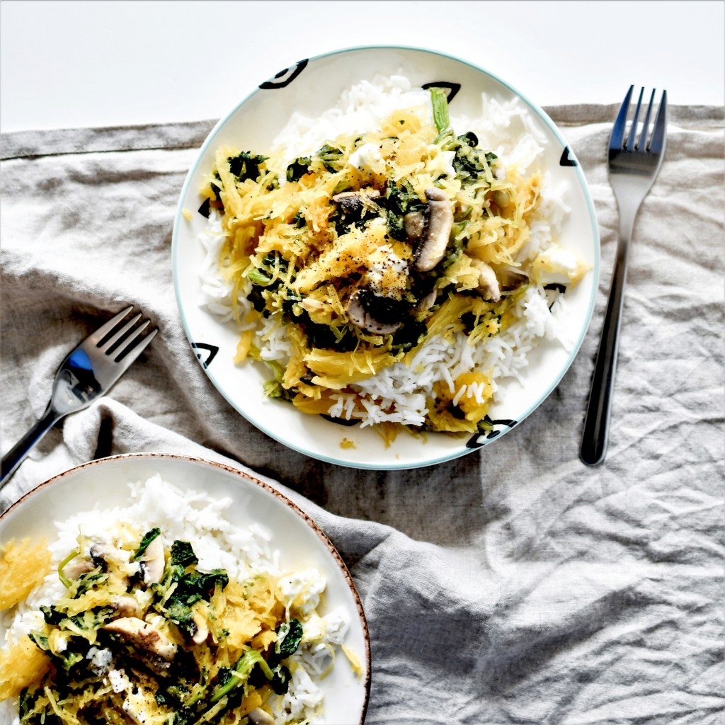 Courge spaghetti sautée – Epinards, Champignons & Feta