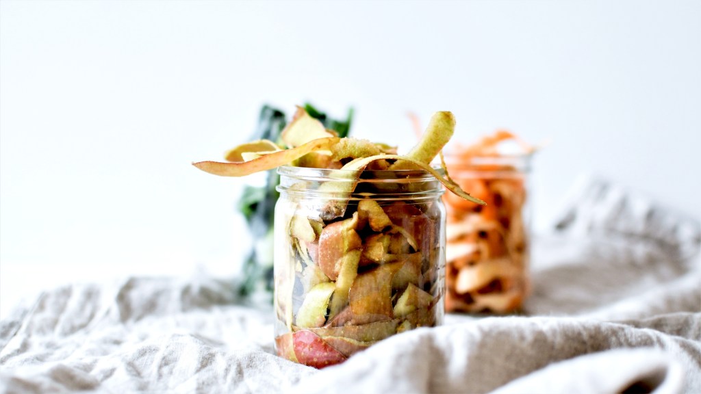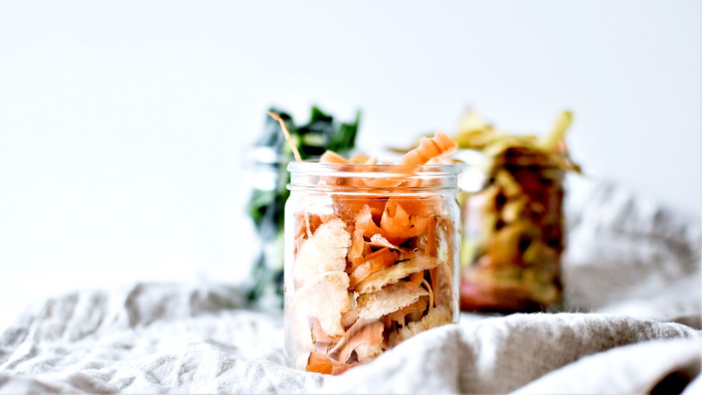 Bien laver les épluchures. Les placer dans un bocal avec 2 c. à s. d’huile d’olive, une bonne pincée de sel et de poivre. Fermer le bocal et secouer pour que l’huile enrobe tous les morceaux.