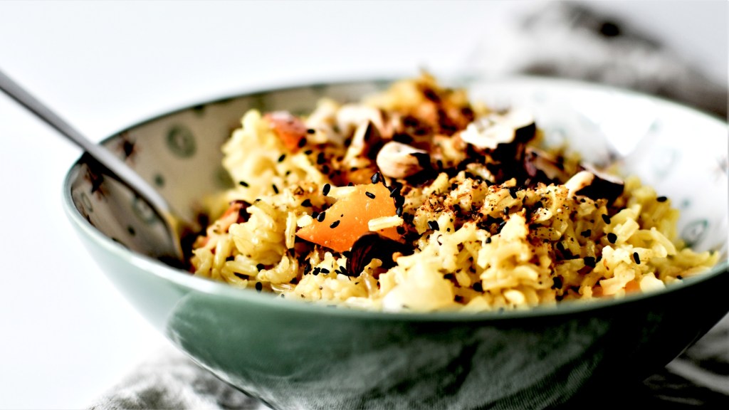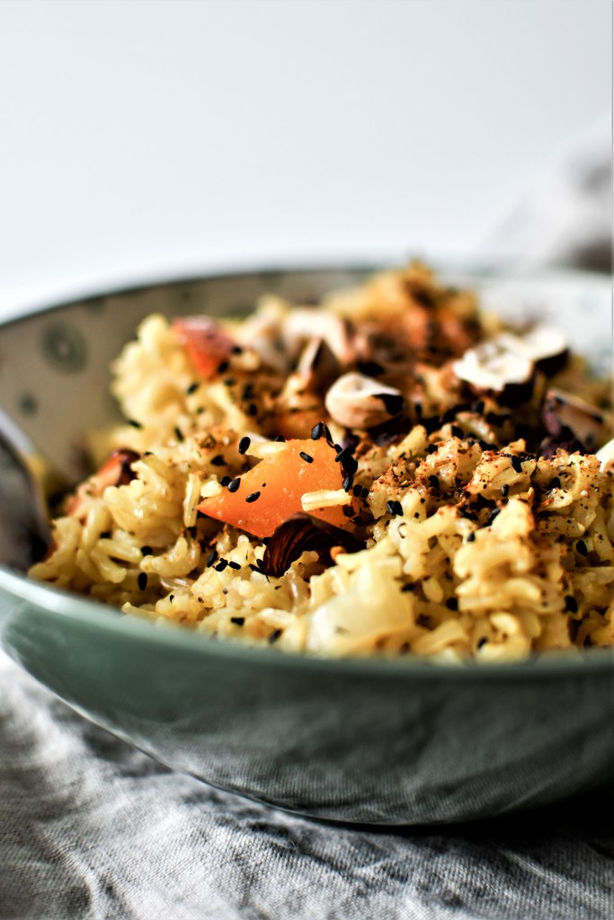Une fois le riz bien cuit, servir dans des bols ou des assiettes et recouvrir de noisettes.