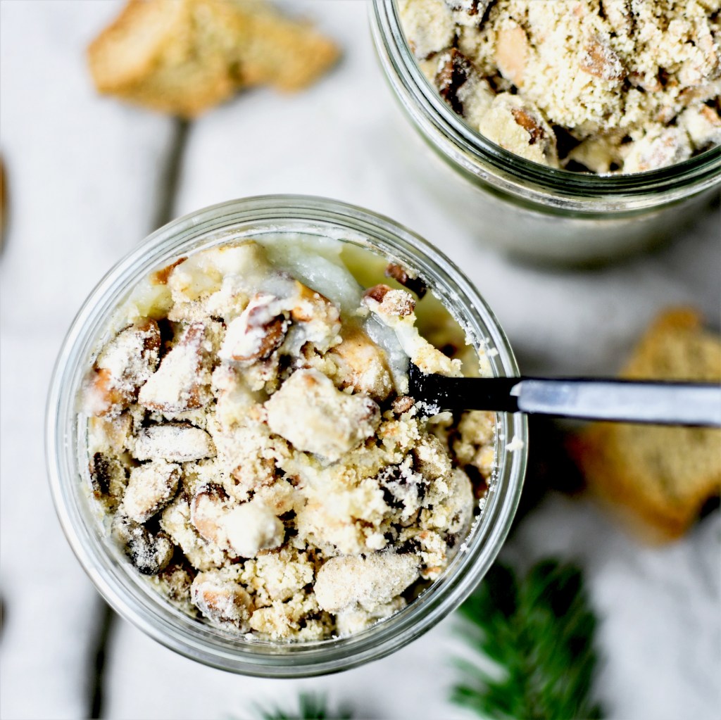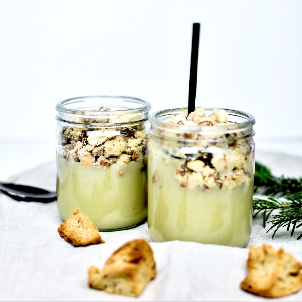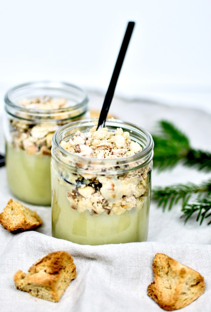 Cette idée pourra convenir à tout le monde pendant les fêtes, en mini verrines pour l’apéro, en entrée ou même en accompagnement de plat. On peut aussi imaginer la purée directement servie dans l’assiette et parsemée de crumble croustillant. Effet garanti !