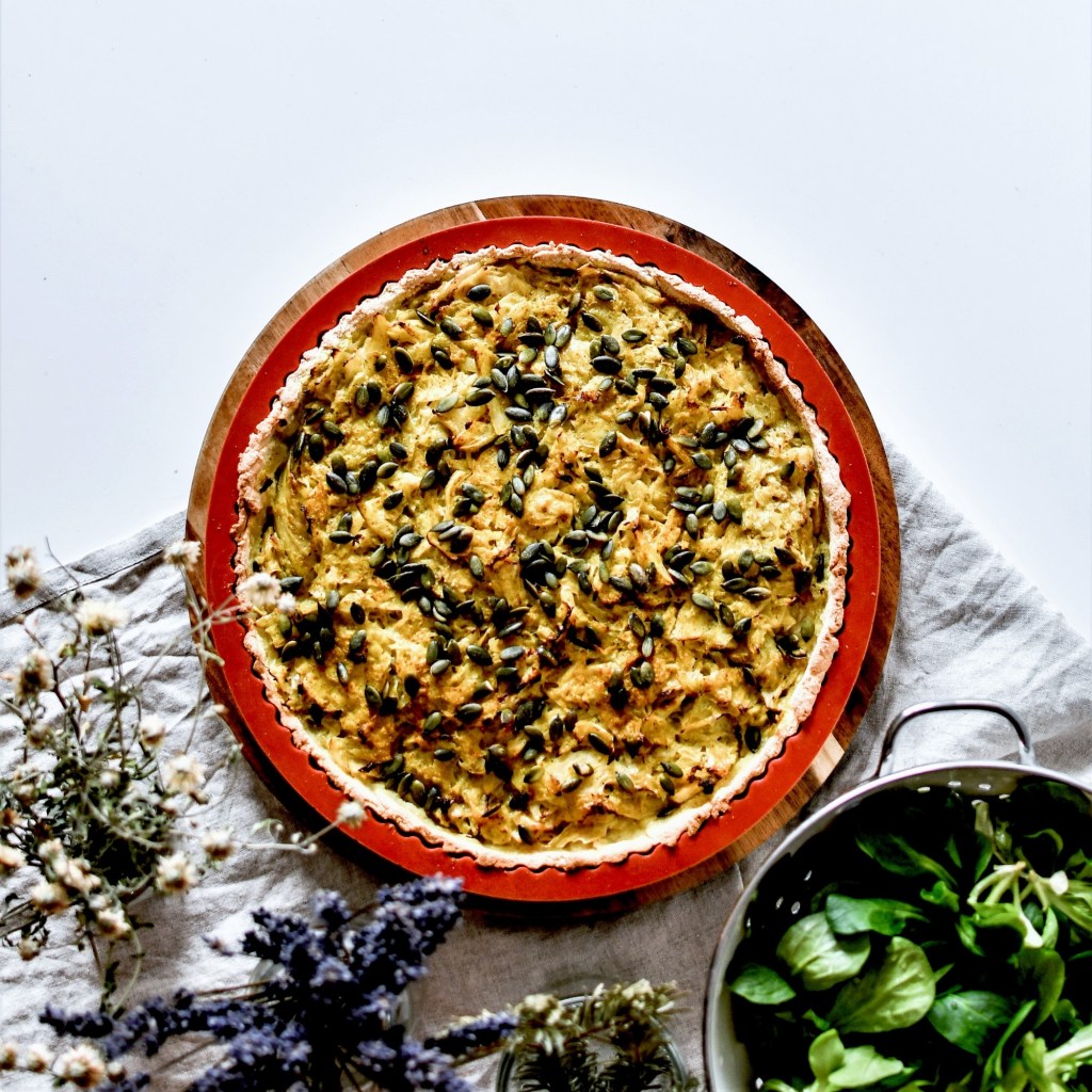 Dans un saladier, mélanger le chou de choucroute, le curry et le lait de coco. Rectifier l’assaisonnement avec le sel et le poivre. Verser le tout sur le fond de tarte. Ajouter les graines.