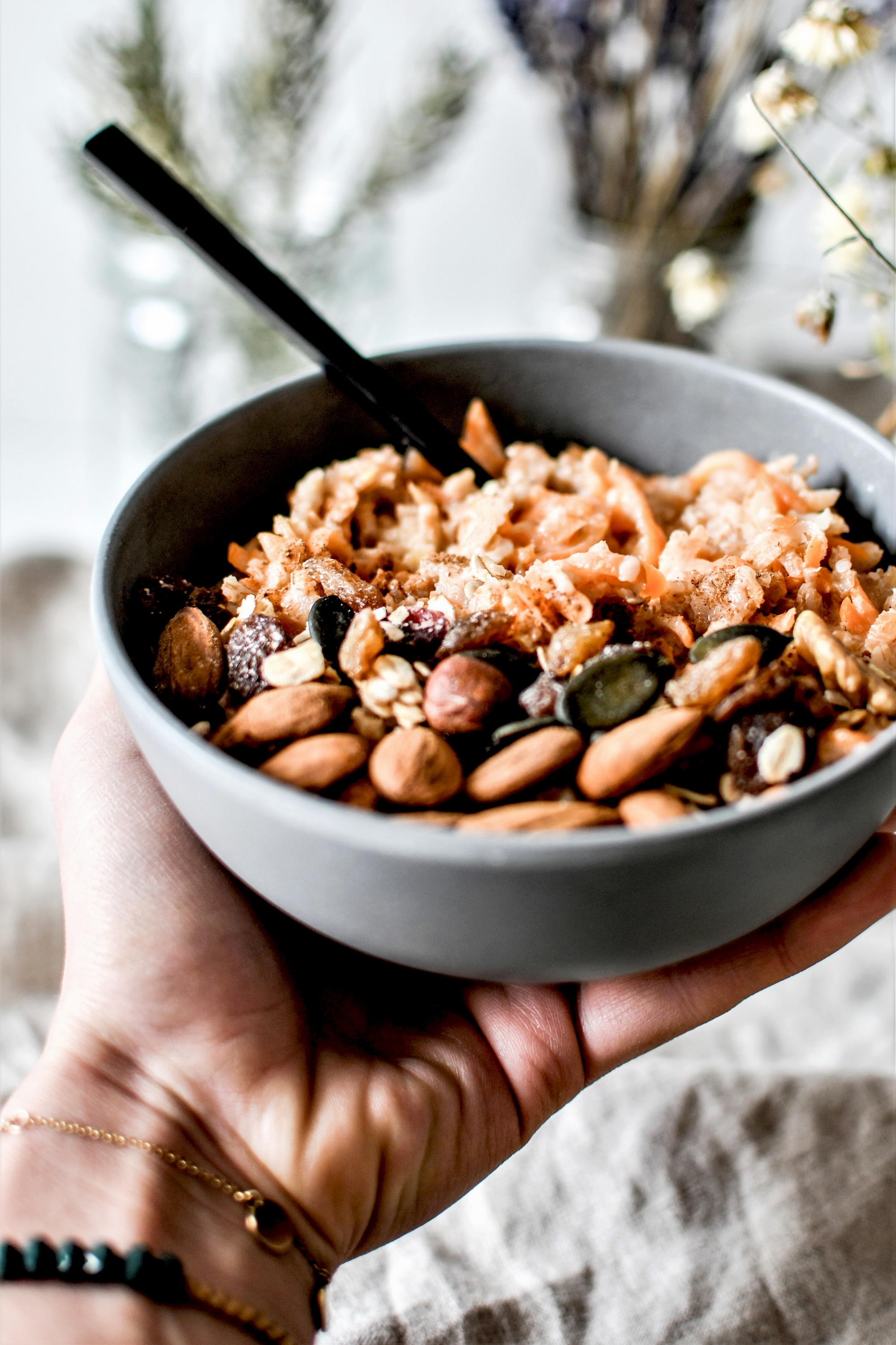 Par ailleurs, cette idée je l’ai chipée à Pauline @lananasblonde sur Instagram. Je n’ai pas pris directement sa recette, mais simplement l’idée que j’ai vu sur l’une de ses stories. J’aime beaucoup son compte, très sincère et naturel. Si vous ne la connaissez pas encore, allez la suivre. D’ailleurs je la trouve si bonne que je suis moi-même étonnée de ne pas y avoir pensé plus tôt. Un carrot cake façon porridge, c’est le genre de twist dont je raffole. :) Au menu, flocons d’épeautre, fruits secs, lait d’amande, cannelle et surtout carottes râpées bio pour un petit déjeuner sain et complet, généreux et gourmand à souhait. On peut évidemment le sucrer ou non, à sa manière. J’ai choisi le sirop d’agave car c’est ce qu’il nous restait au réfrigérateur, mais on peut imaginer y mettre du miel, du sucre complet ou du sirop d’érable pour une touche encore plus anglo-saxonne. Bref, comme d’habitude, une belle manière de pimper son petit dej, selon ses envies