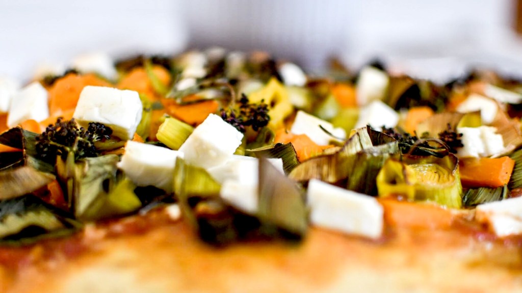 La pizza c’est un peu le plat facile pour vider son frigo, ses fonds de bocaux et écouler les derniers légumes du panier. Mais pour qu’elle soit réussie, la clé c’est une bonne pâte moelleuse (avec une farine de qualité) et de bons ingrédients : ici un coulis de tomates des Jardins de la Montagne Verte, un butternut, un poireau et des brocolis à jets (ou brocolini) bio et locaux, de la feta grecque de chez Aliomis (je vous rappelle que la boutique reste ouverte malgré le confinement et qu’on peut y passer commande grâce au click and collect) et du fromage de chez Coté Nature.