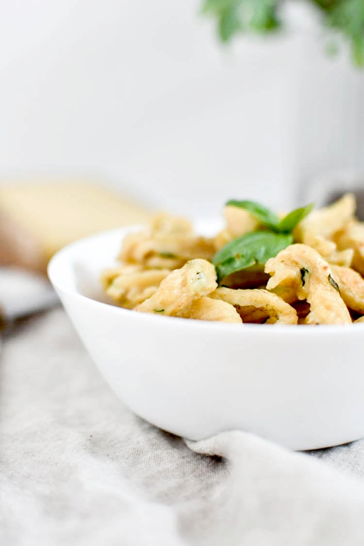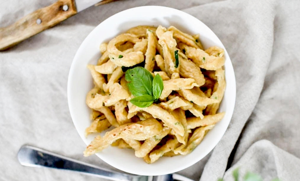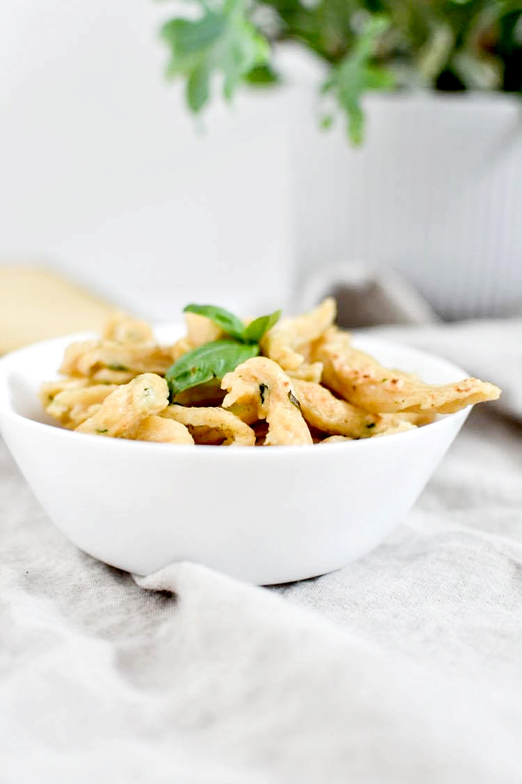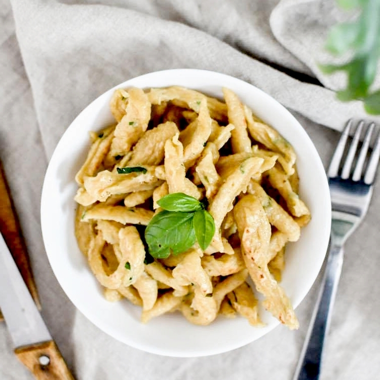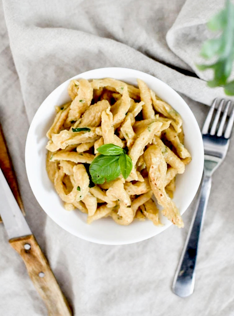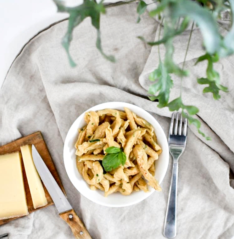 Pourtant, depuis le début du confinement, impossible de résister à l’envie de faire des spaetzele. Parce que j’adore ça. La recette est ultra simple et c’est customisable à l’infini. On peut y mettre les herbes que l’on veut, on peut aussi y mettre directement du fromage, de la feta, des tomates séchées … bref, on peut faire des spaetzele à n’importe quoi tant qu’on respecte les proportions : 1 œuf pour 100 g de farine. Aujourd’hui, je vous en propose une recette très simple avec de la farine de grand épeautre et du basilic frais de la cour de la maison en travaux (d’ailleurs je crois bien qu’il a froid là, il faut que je pense à le rentrer cette nuit).