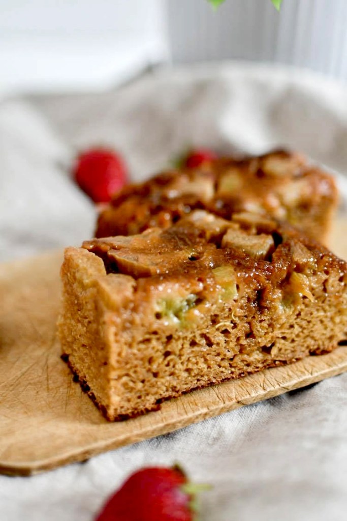 Le résultat est incroyable : la rhubarbe du dessus est vraiment fondante, légèrement caramélisée et sucrée juste comme il faut. La pâte, qui a bénéficié de la vapeur d’eau de la rhubarbe, est humide et moelleuse à souhait. Le sucre de coco apporte une jolie couleur caramel et gourmande au gâteau. Et en bouche, c’est … sublimement agréable. Doux et acidulé comme il faut. Le gâteau parfait pour accompagner un thé ou un café.