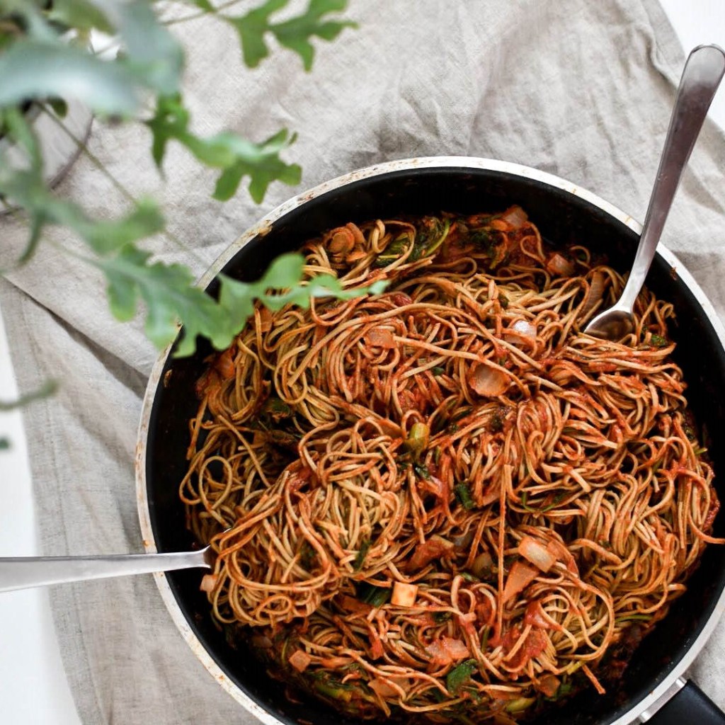 Pendant ce confinement, on a mangé beaucoup, beaucoup de pâtes. Du coup j’ai essayé de varier les sauces et les plaisirs, et les types de pâtes aussi. Ici, par exemple, j’ai utilisé des tagliatelle de soja vert (edamame), de la marque Fibritti et commandées sur Kazidomi.
