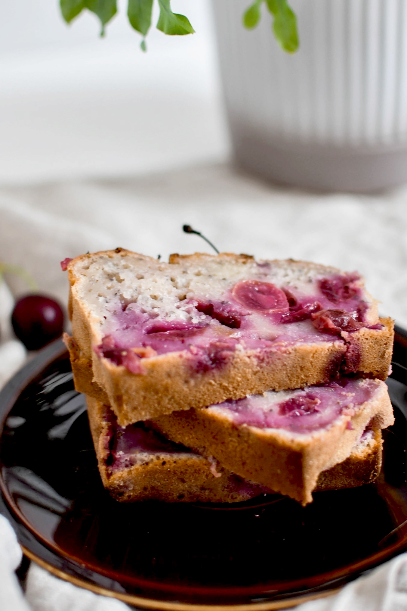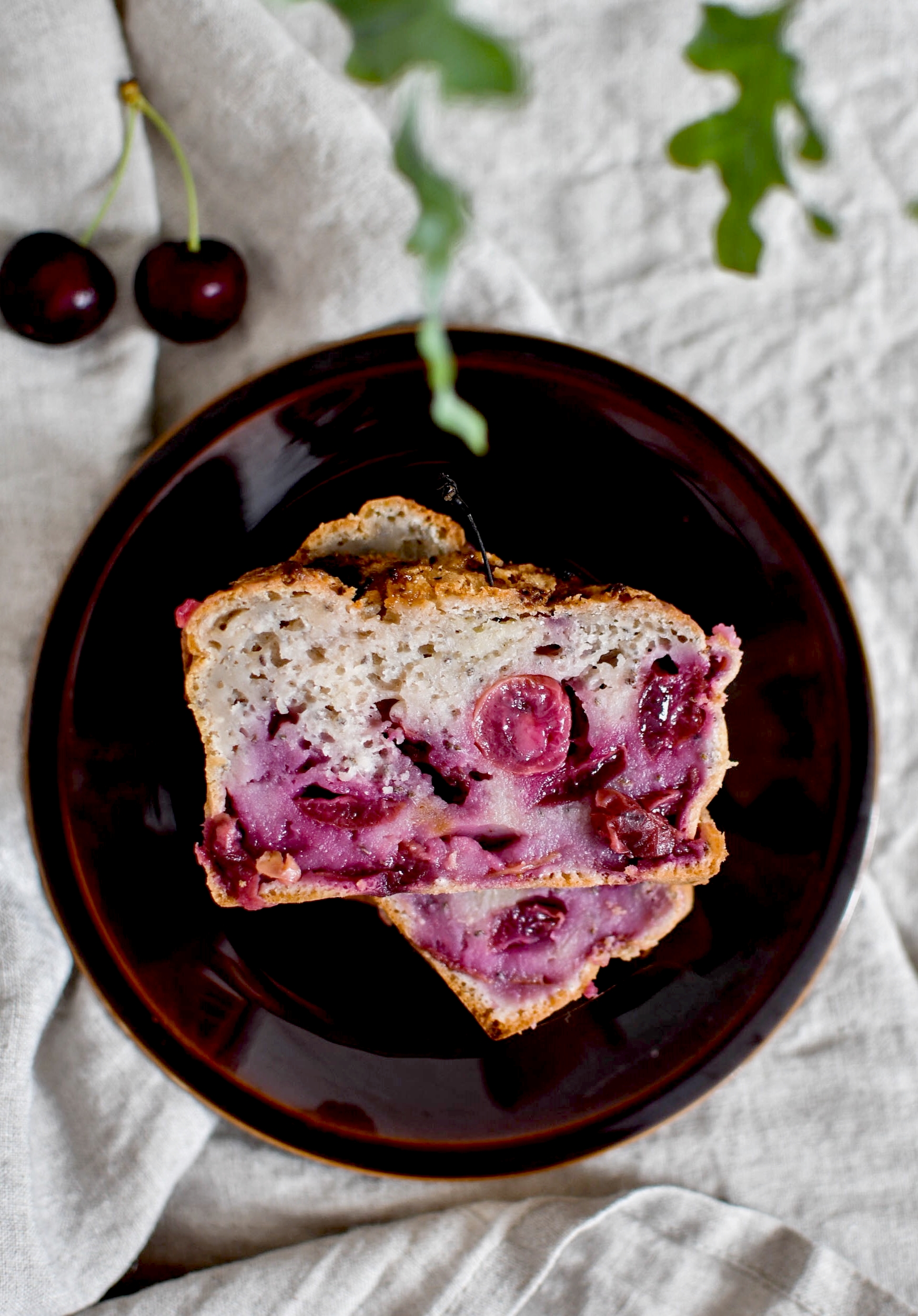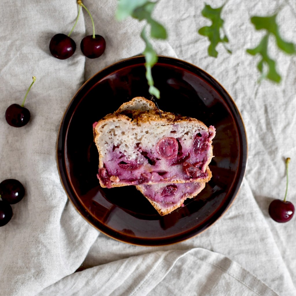 Pour cette première recette je vous propose un cake généreux et gourmand aux cerises noires et graines de chia. Il est végan et vraiment délicieux. Sa texture est humide comme il faut, et les cerises apportent cette petite touche d’acidité que j’aime tant. C’est vraiment un fruit plein de ressources et facile à décliner.