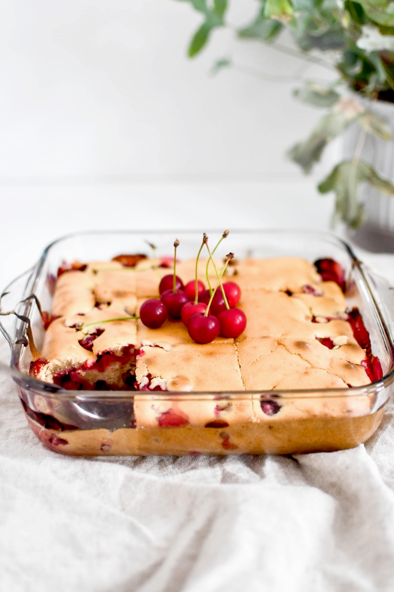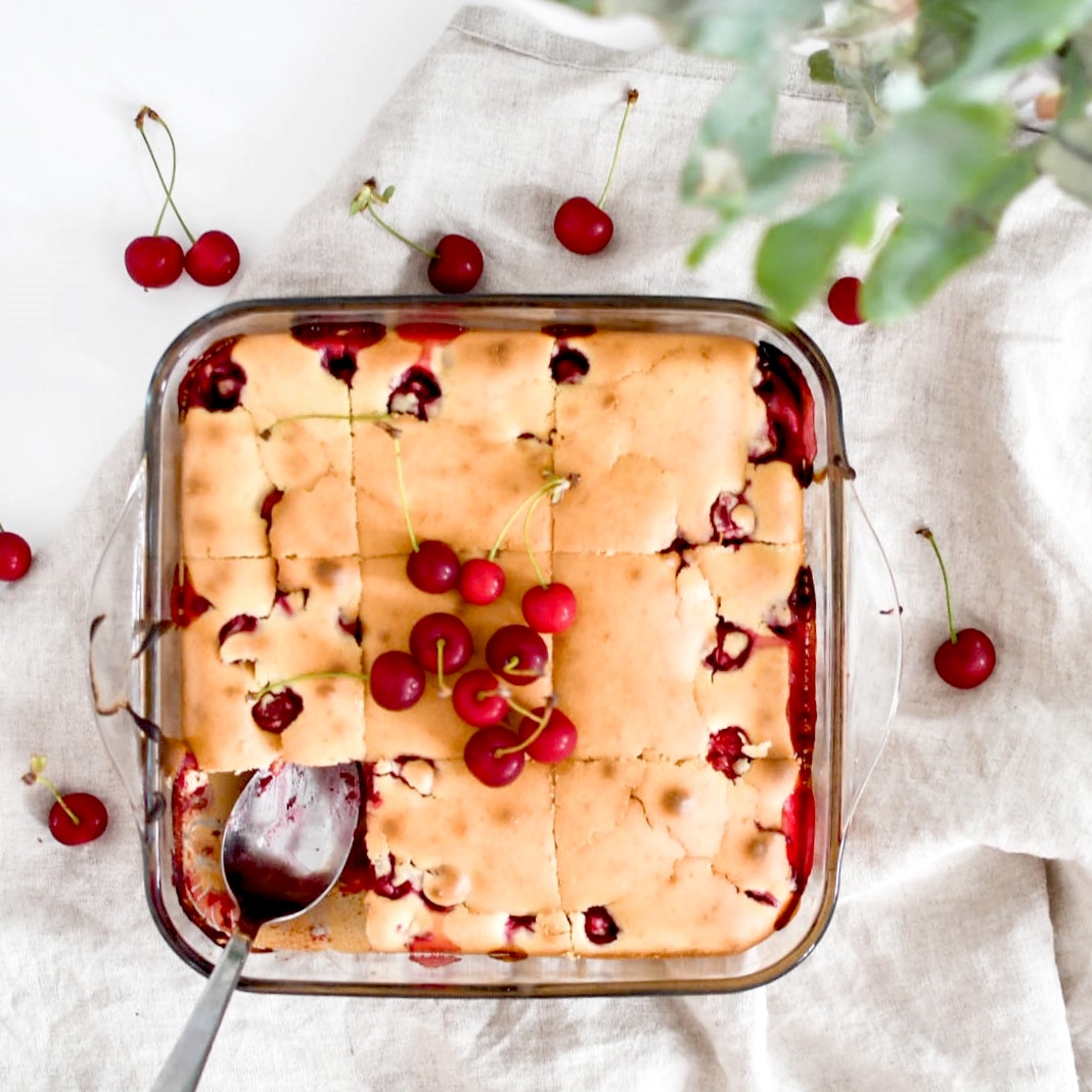 Il me restait une petite bouteille de crème fraiche de la ferme Will dont je ne savais pas quoi en faire. Je l’ai donc intégrée à ce cake (en remplacement du beurre et du lait) pour un résultat moelleux, tout doux et qui casse un peu l’acidité des griottes. C’était une superbe idée, le cake est généreux et addictif. Ca fait 3 jours que je m’en empiffre. :)