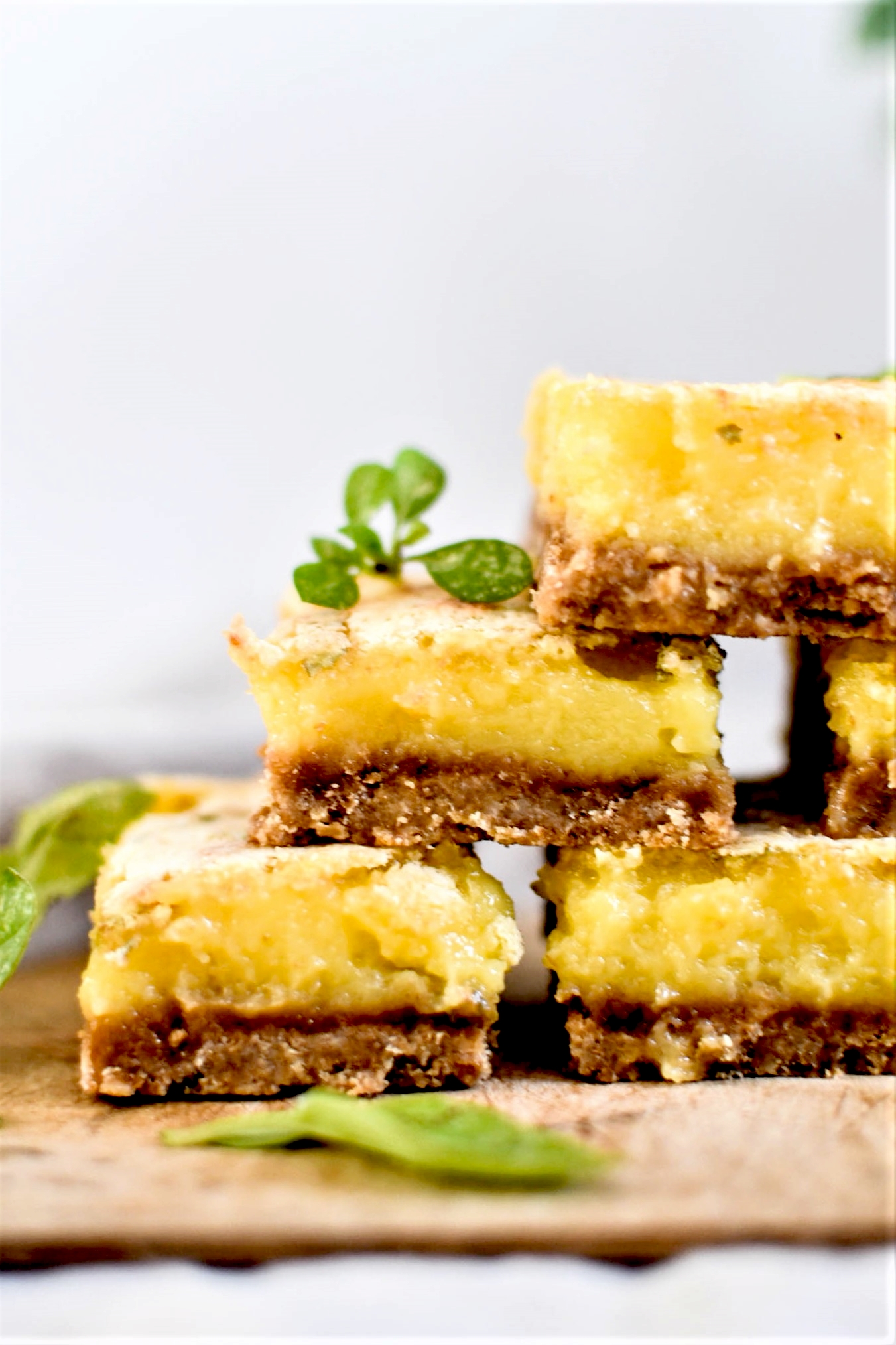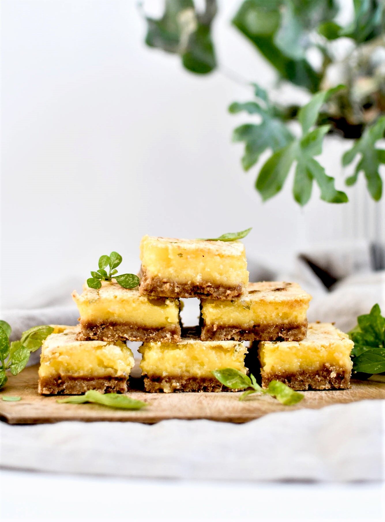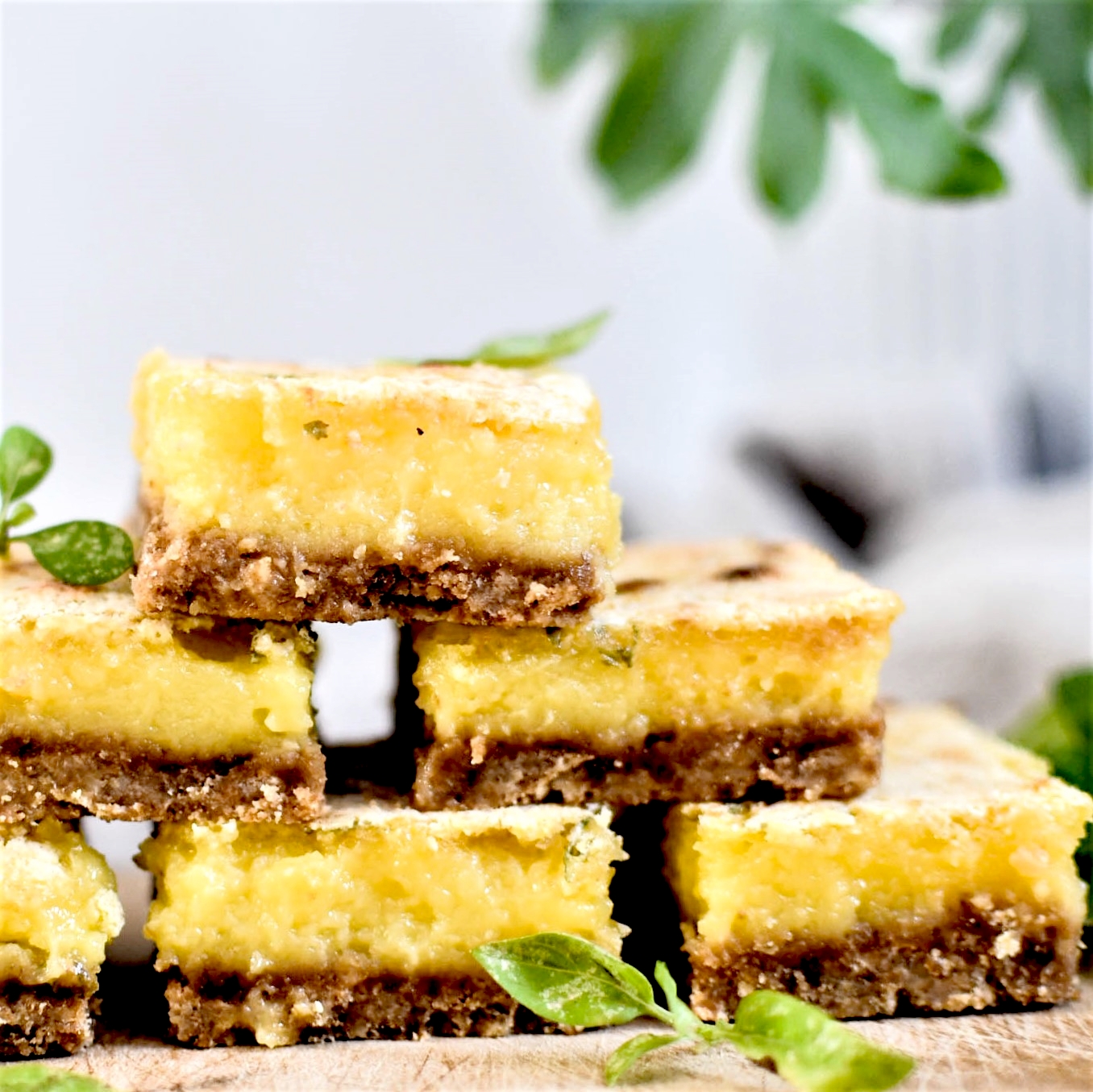 Le citron est le parfum que j’affectionne le plus au monde. Que les recettes soient sucrées ou salées, je les aime toujours lorsqu’elles sont bien citronnées. Vous commencez à le savoir je pense, je suis accro à l’acidité, à tout ce qui picote l’arrière des joues et de la langue, à tout ce qui rafraichit en été. Je vous avais d’ailleurs déjà proposé une recette de lemon barrs au sésame ici. Mais je crois que celle-ci a ma préférence. Le mélange citron et basilic est toujours un sans faute, et particulièrement dans cette recette ultra crémeuse sur le dessus et croustillante sur le dessous. D’autant plus que j’ai utilisé le basilic citronné du jardin, qui s’avère être incroyablement parfumé. Le fait d’utiliser du sucre complet dans la pâte ajoute un aspect caramélisé et croquant. Je n’en mets pas dans la crème pour qu’elle garde son beau jaune vif, mais ce ne serait absolument pas un problème de le faire. Ce n’est qu’une question de visuel.