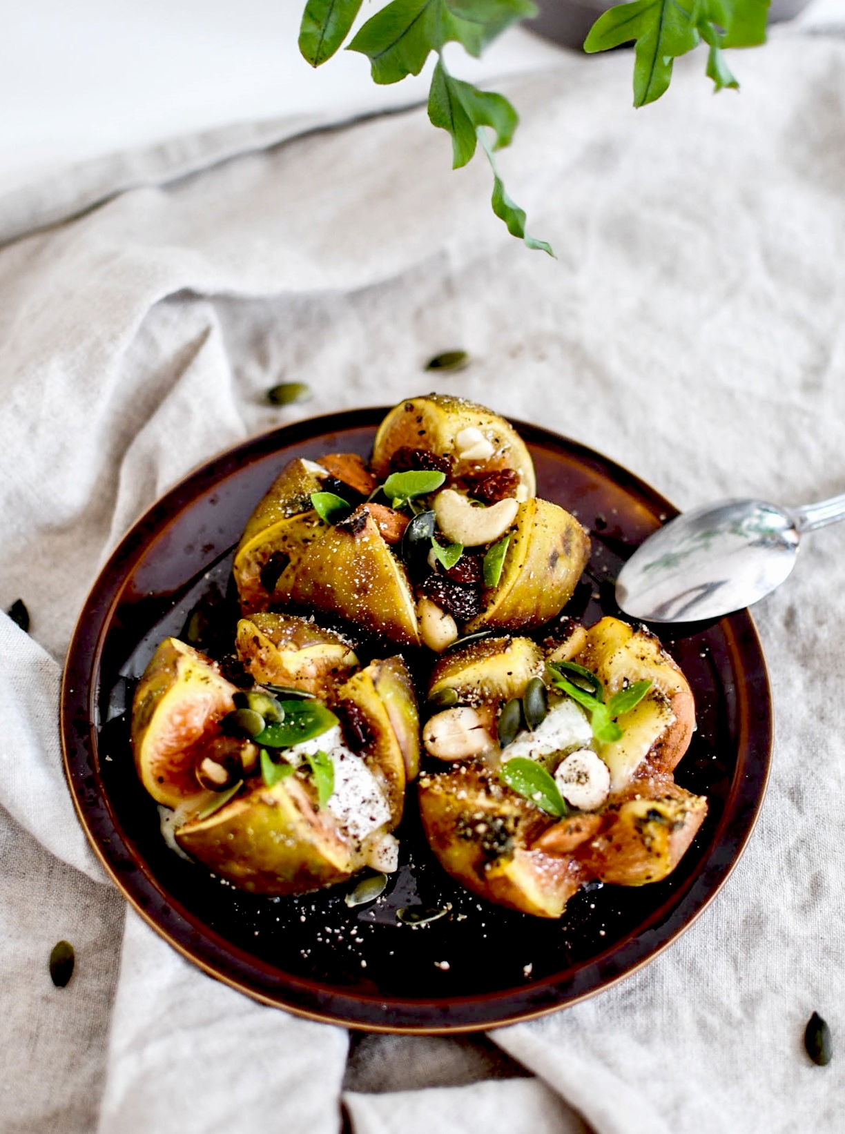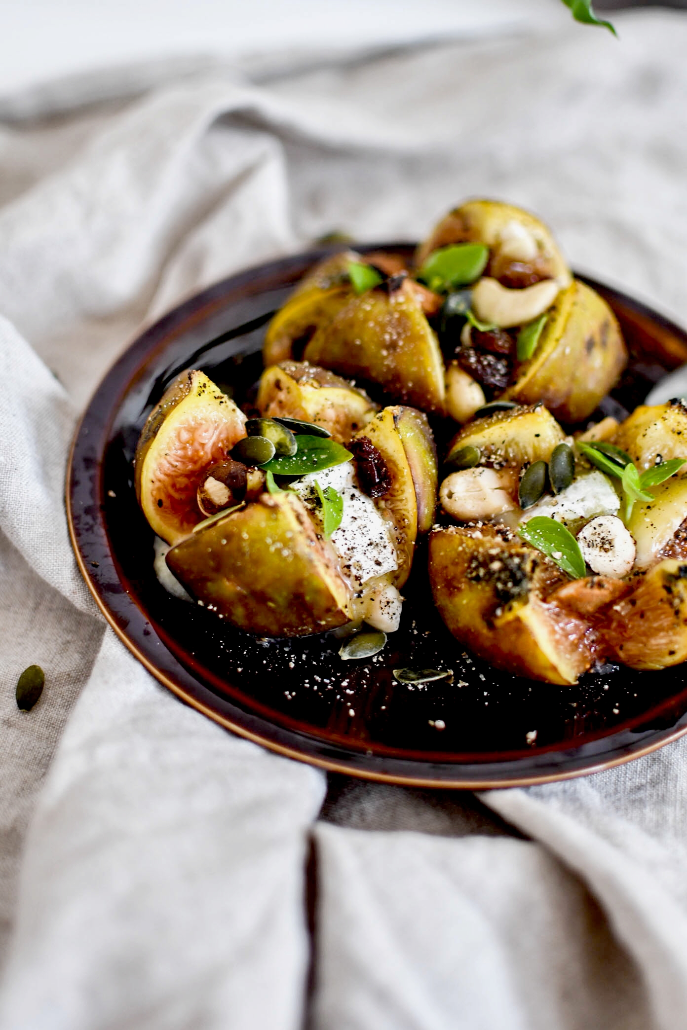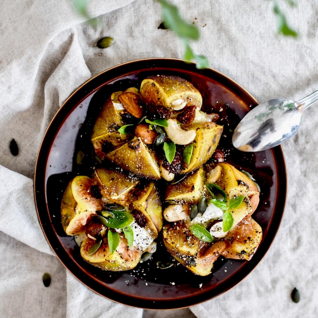 Laver les figues et inciser une croix sur le dessus. Y déposer un morceau de camembert, et compléter avec les fruits secs et les graines de courge. Saler et poivrer généreusement, arroser d’un fin trait d’huile d’olive.