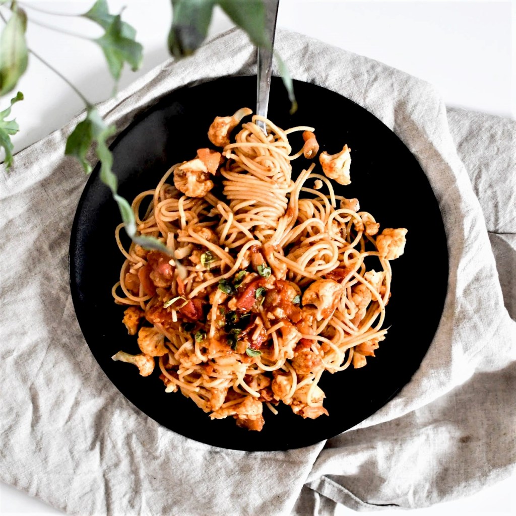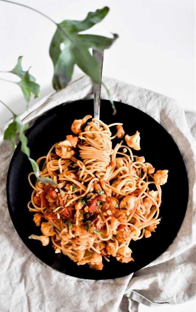 Manger sainement et pour pas cher n’a jamais été aussi simple. Je ne le dirais jamais assez. L’alimentation bio n’est plus inaccessible, les paniers de légumes bio prolifèrent dans les villes, les fermes, les AMAP … et on peut faire tellement de choses avec un seul panier. Dans celui de la semaine dernière j’ai eu la chance d’avoir encore quelques tomates et surtout un énorme chou-fleur que j’ai pu décliner en 3 plats : des petits dips pour l’apéro avec une sauce toute simple au yaourt et au curry, ces merveilleuses spaghetti (2 portions), et une soupe avec des queues du chou-fleur et un butternut (mélange original et hyper onctueux).