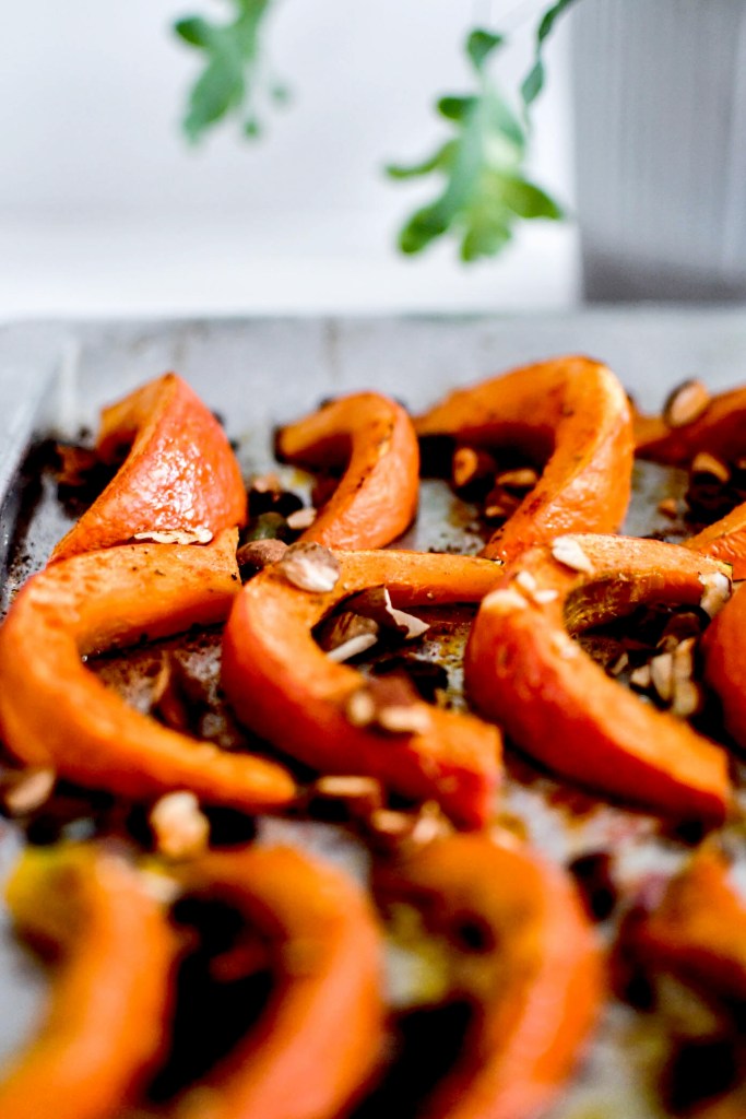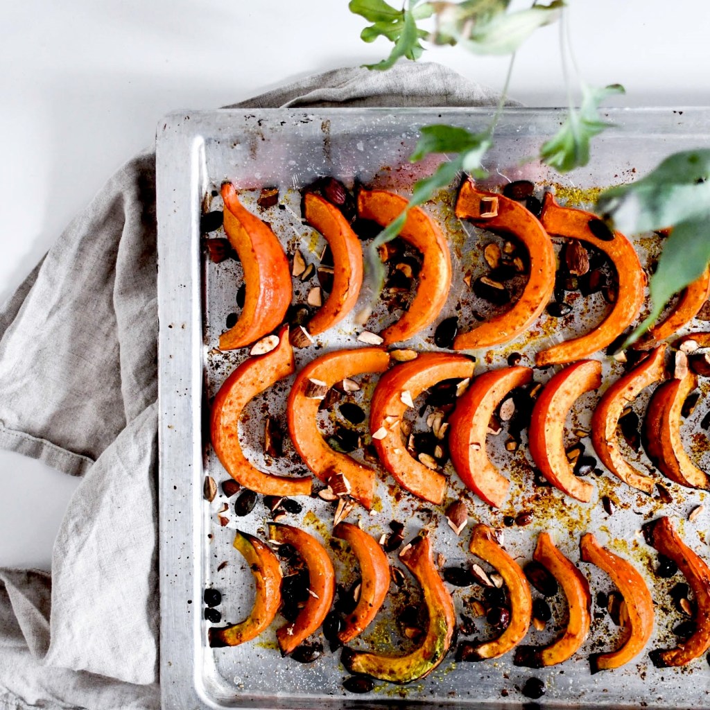 Cette recette c’est un peu ma chouchoute de l’automne et à chaque fois je la recustomise un peu. Ca en fait un bon nombre de variantes, mais toujours avec le même plaisir. J’aime tellement le goût et la texture du potimarron rôti, surtout qu’on peut manger la peau sans problème (ce qui n’est pas le cas de toutes les sortes de courges). Bref, on adore ici. Les graines ressortent grillées et vraiment parfumées, les petits raison secs apportent le sucre nécessaire et se marient tellement bien avec le cumin. Bref … c’est un délice.