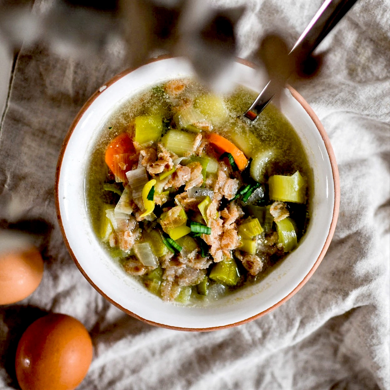 On peut la réaliser au choix avec des flocons d’avoine ou d’épeautre (comme ici). En cuisant, ils libèrent une texture et un goût vraiment tout doux qui rend la soupe onctueuse et savoureuse. Evidemment on peut les intégrer dans n’importe quel type de soupe mais moi je les préfère dans les soupes non mixées et avec des légumes qui ont du goût comme des poireaux, des oignons et des carottes (sans doute mon mélange préféré).