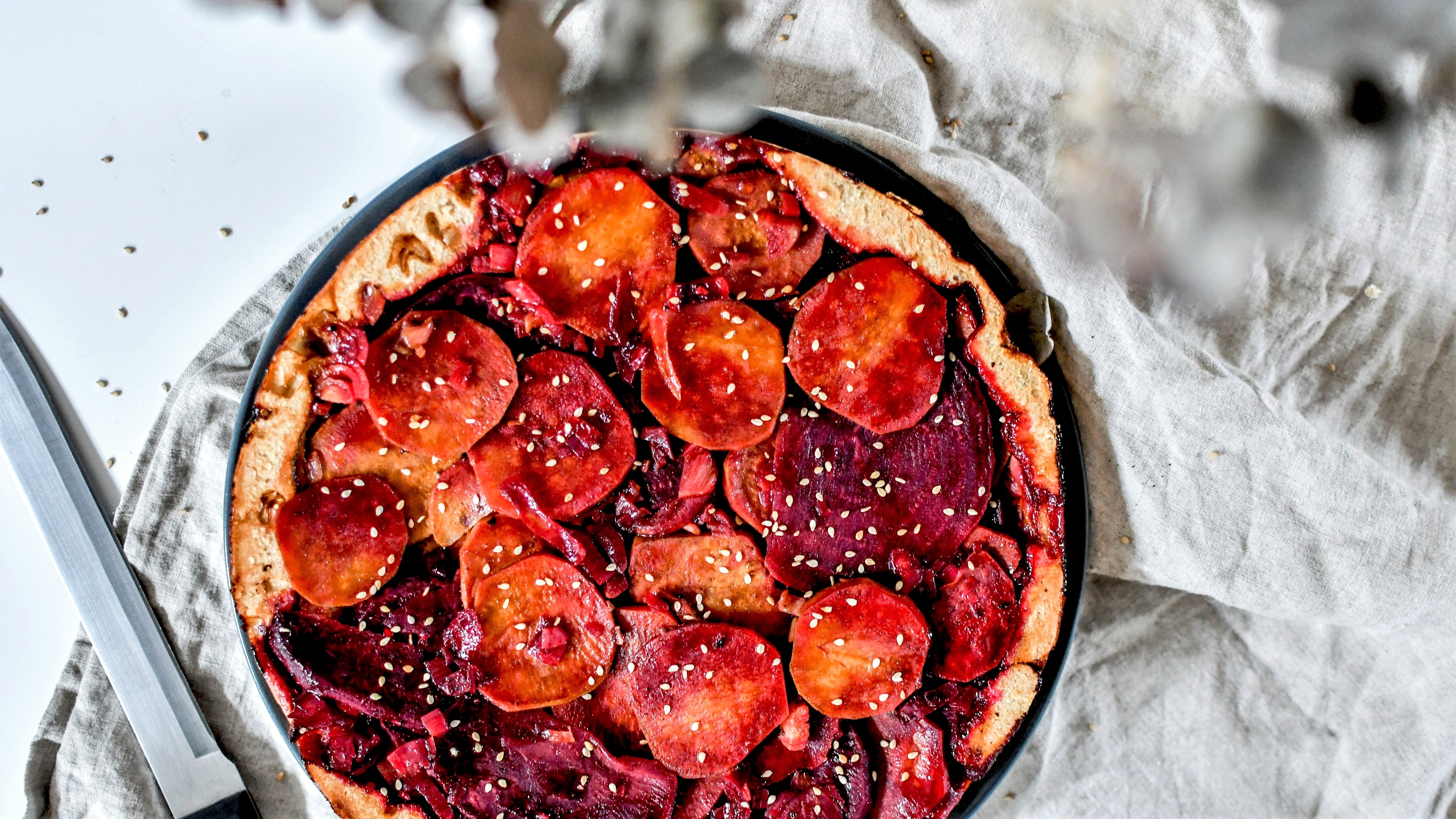 Les betteraves sont partout en ce moment. Il y en a quasi chaque semaine dans mon panier de légumes et j’avoue commencer à peiner à trouver des idées originales pour les cuisiner. Je vous avais déjà proposé une tatin de betterave l’an dernier ici, la recette d’aujourd’hui lui ressemble beaucoup mais est un peu plus gourmande avec l’ajout de patates douces (elles aussi locales) et surtout d’échalotes qui réhaussent le goût. La pâte est végane, classique mais parfaite pour la cuisson à l’envers et évidemment on peut y ajouter des graines, des épices et toutes sortes de petits agrément pour lui donner du croquant et du goût. Moi je l’aime déjà beaucoup comme ça.