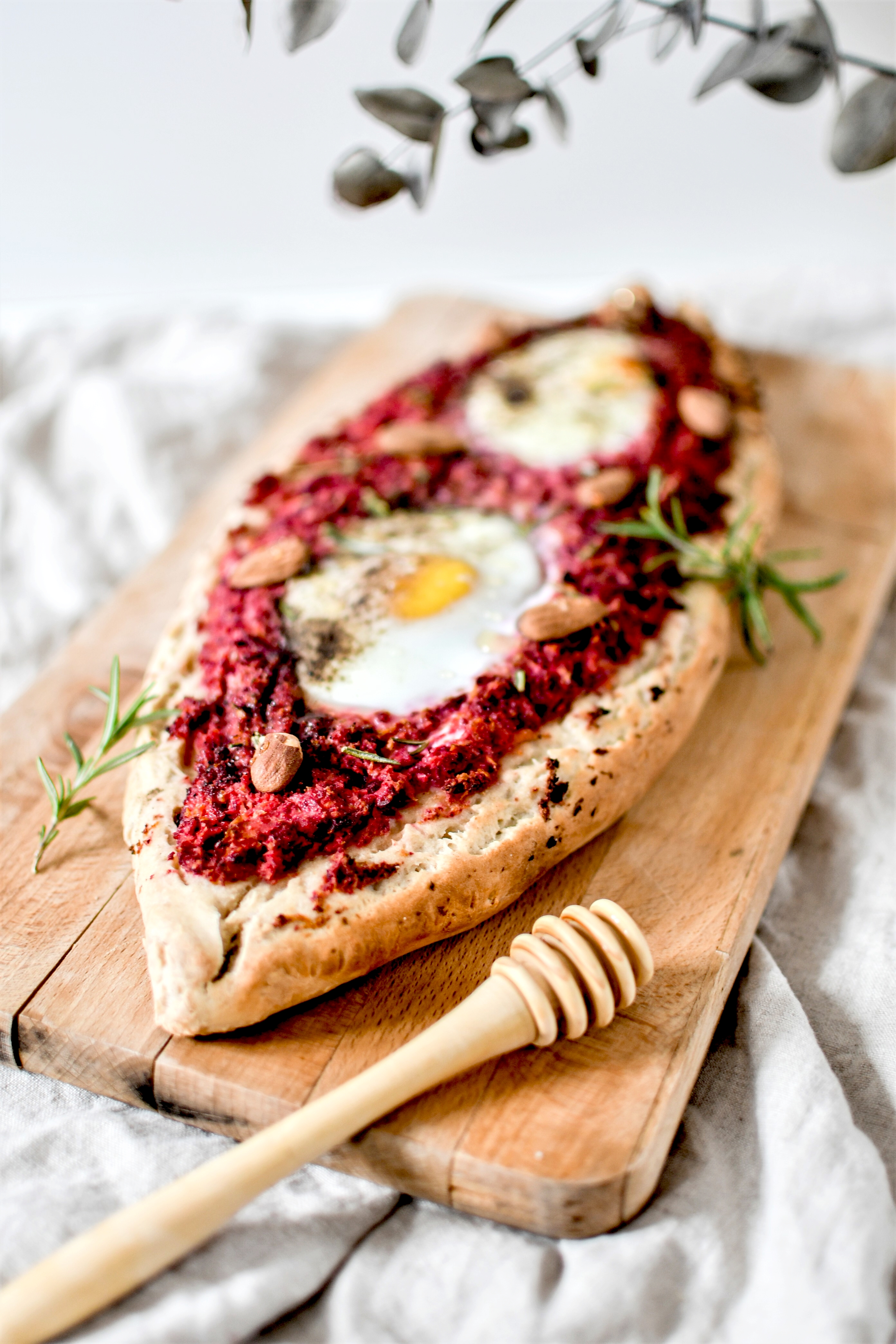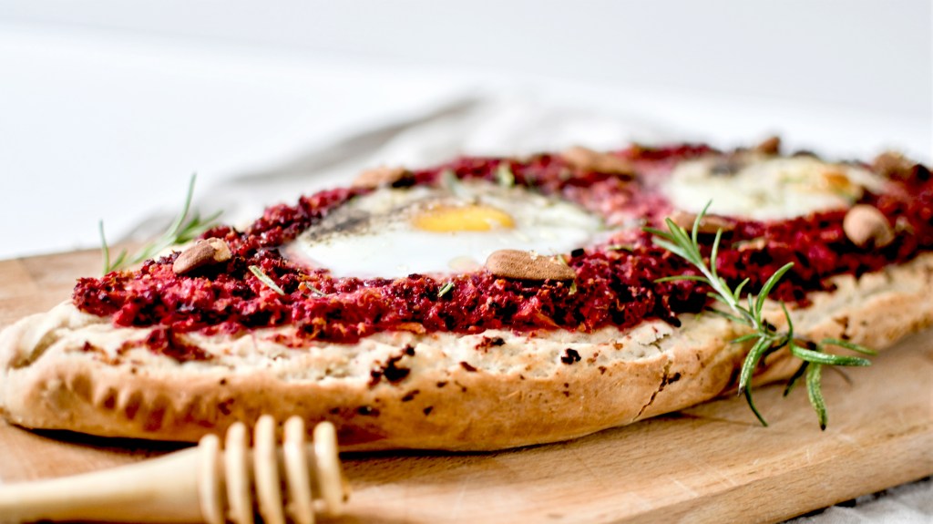 Mais n’ayant plus de sauce tomate, ni de fromage pour refaire une fournée le lendemain (la loose totale), j’ai eu l’idée de l’utiliser pour un faire un pide [pidé], vous savez, ce plat turc à base de pâte légèrement levée et garnie, en forme de bateau. Seulement voilà, j’y ai mis tout ce qu’il me restait au frigo : une salade de betterave rouge et carottes que j’ai mixé avec du chèvre frais, deux œufs, des amandes, du miel … A expérience hasardeuse, résultat insoupçonné : j’avais vraiment envie de vous faire part parce que je me suis régalée.