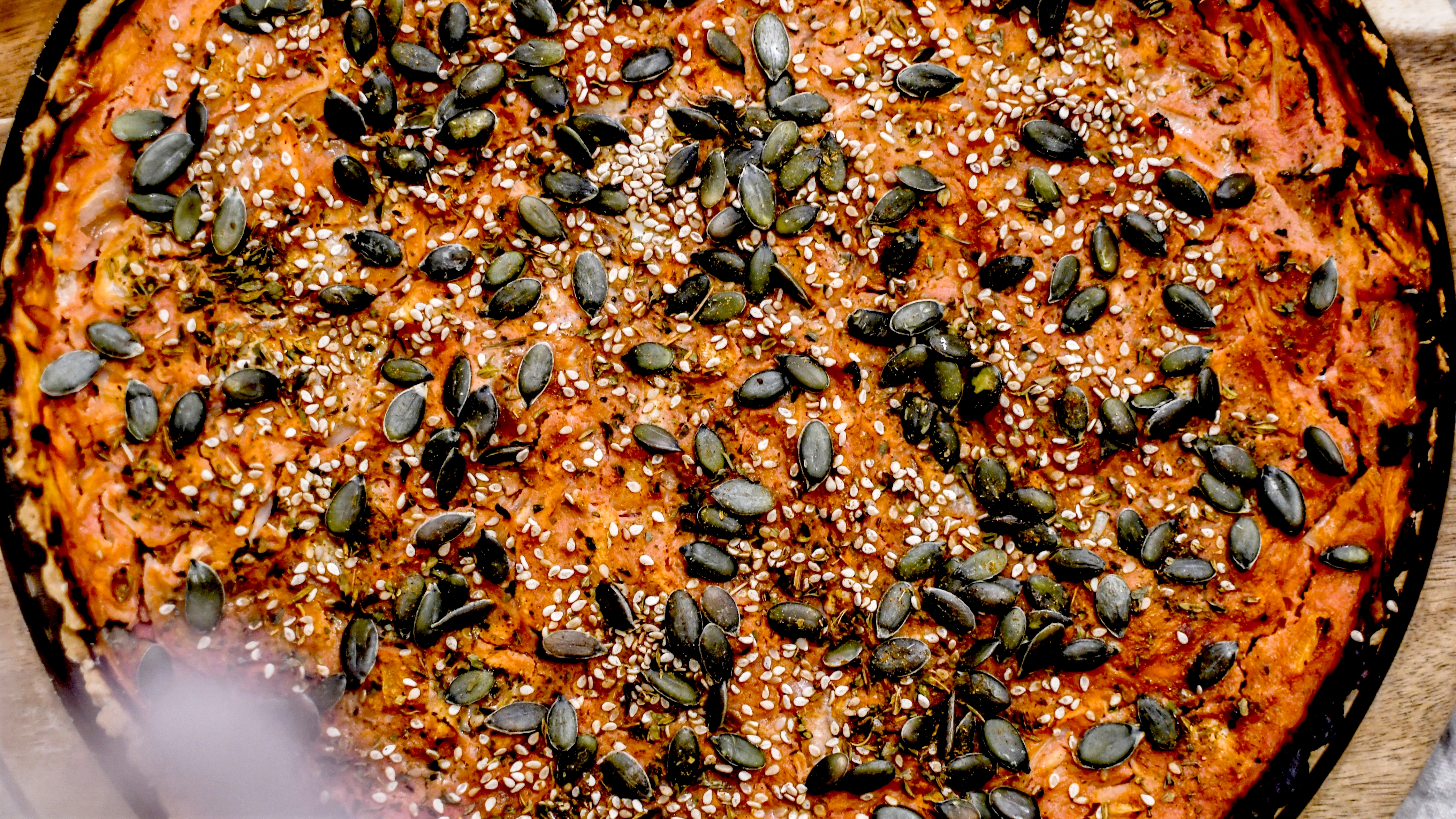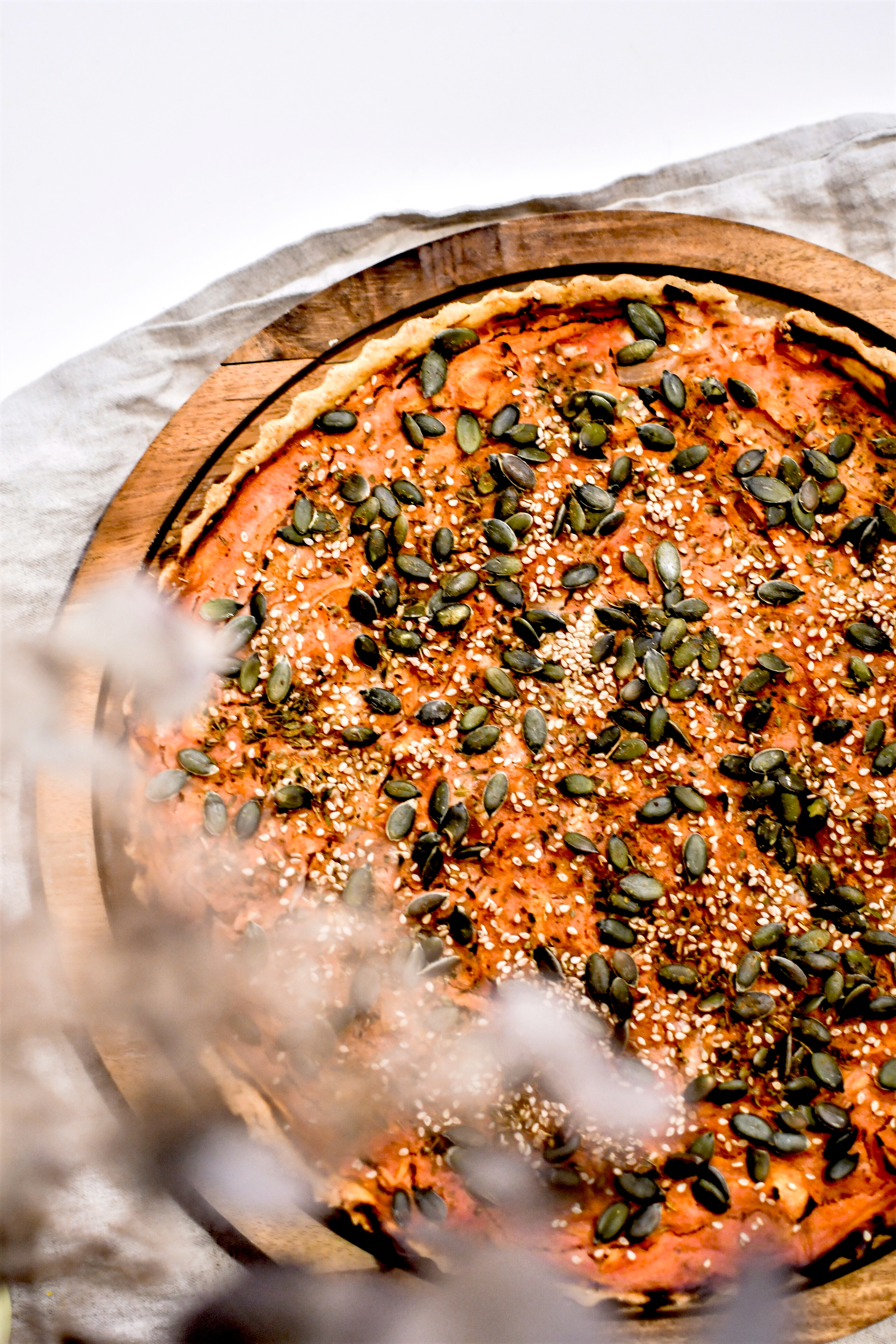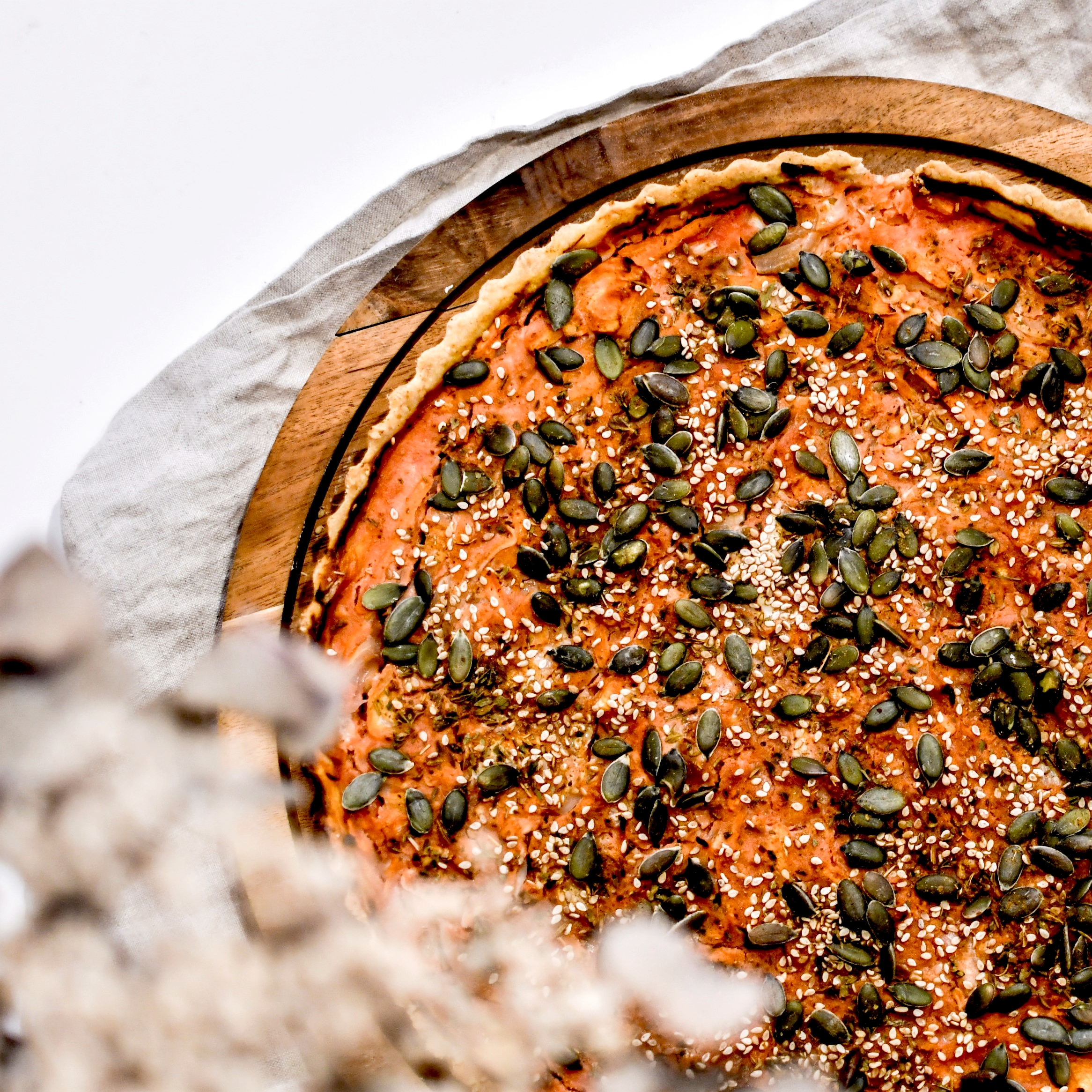 Déposer les légumes sur le fond de tarte. Verser par dessus la sauce tomate et bien répartir le tout sur l’ensemble de la tarte. Saupoudrer de graines, rectifier l’assaisonnement avec le sel et le poivre.
