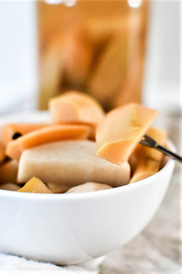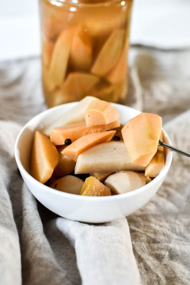 Une recette vraiment originale de pickles et qui permet d’écouler des légumes dont on ne sait trop quoi faire en général. On peut évidement la reproduire avec n’importe quel légume racine : rutabaga, navets blanc ou violets, panais, radis green … tout !