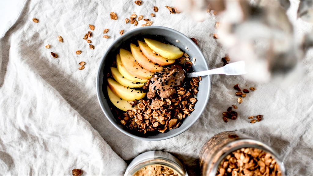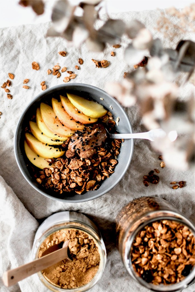 Ici, je l’ai marié avec des pommes, du lait d’avoine (fait maison), et une petite cuillérée de purée d’amande (mon gros péché mignon du matin). Le kiffe totale.